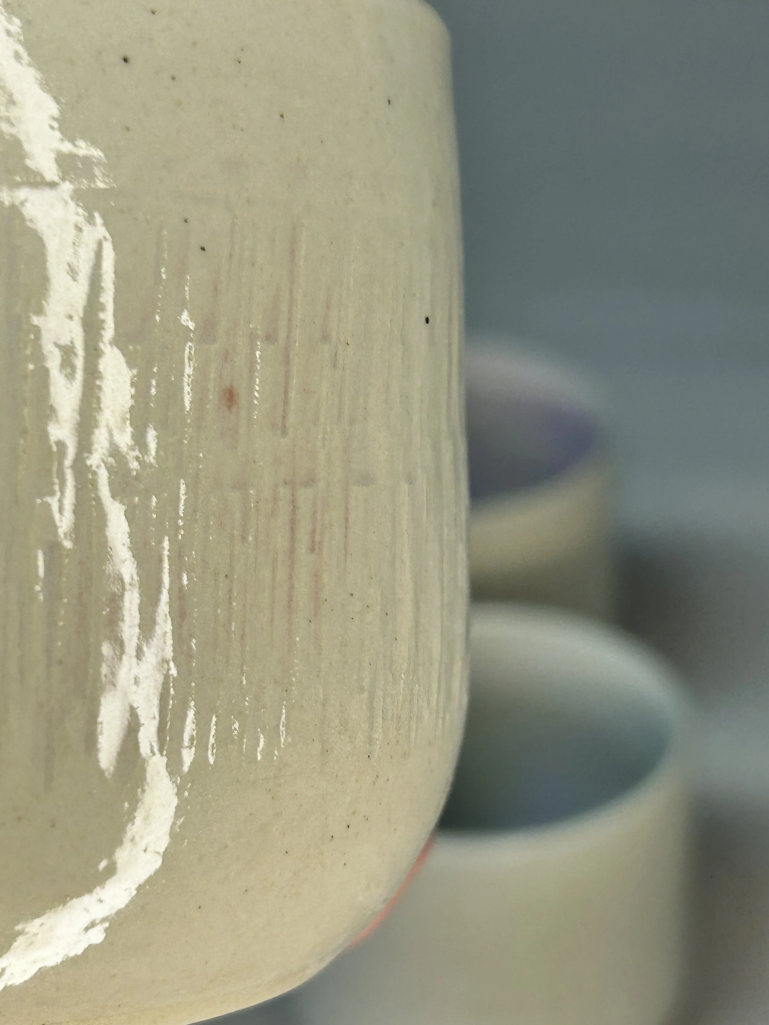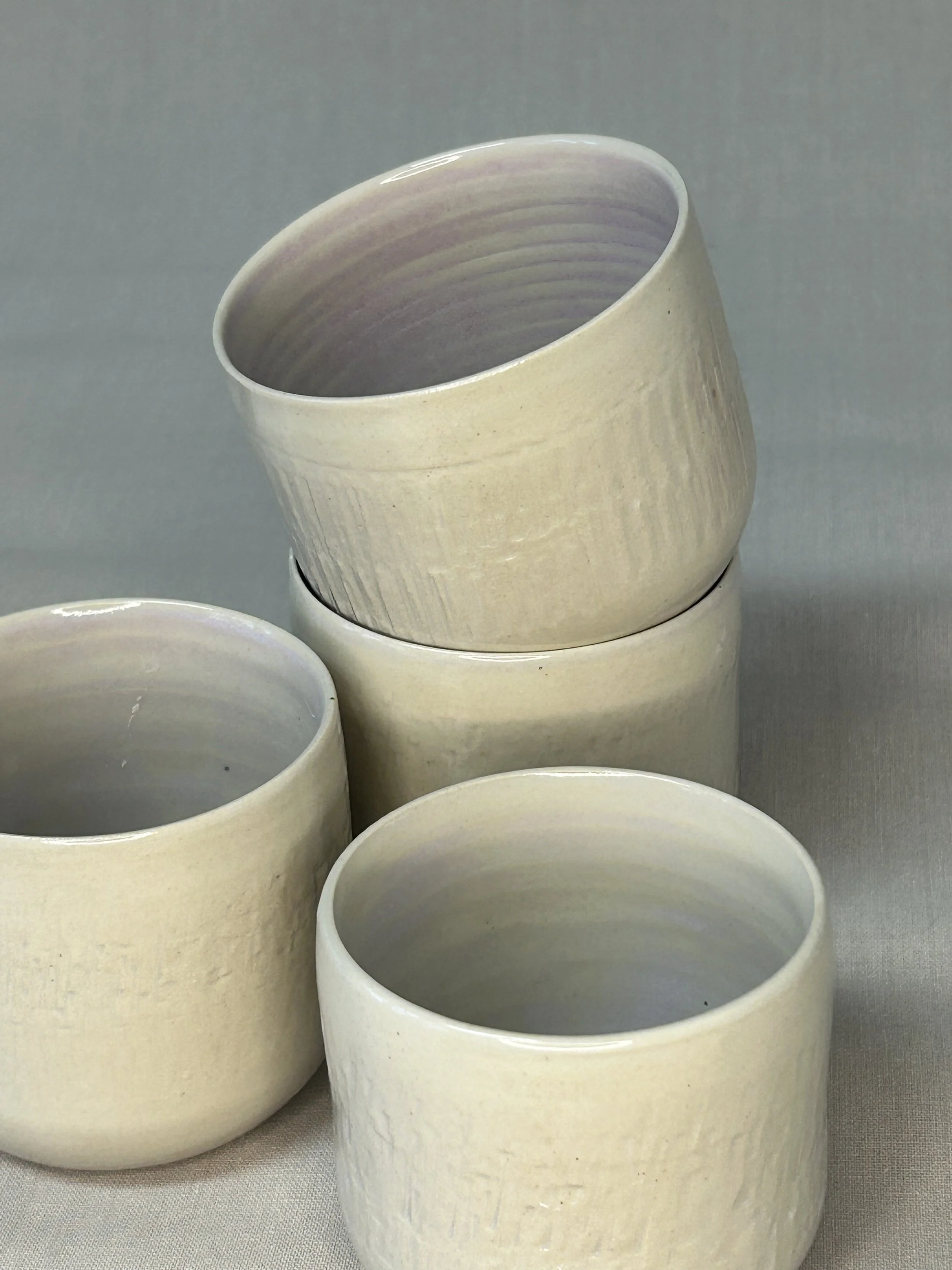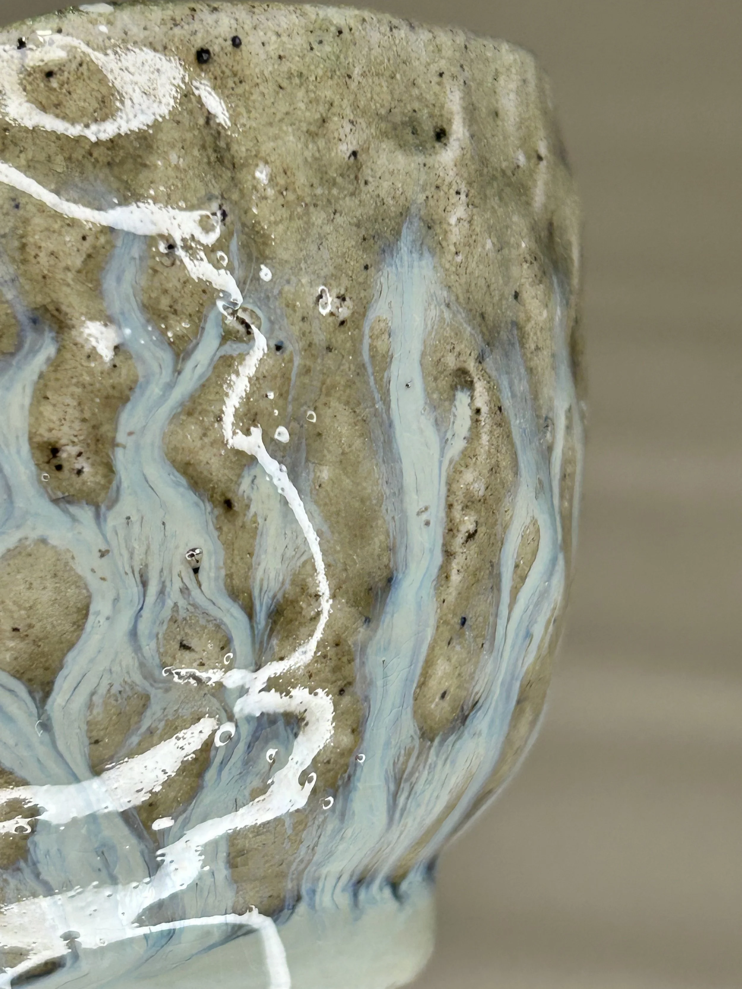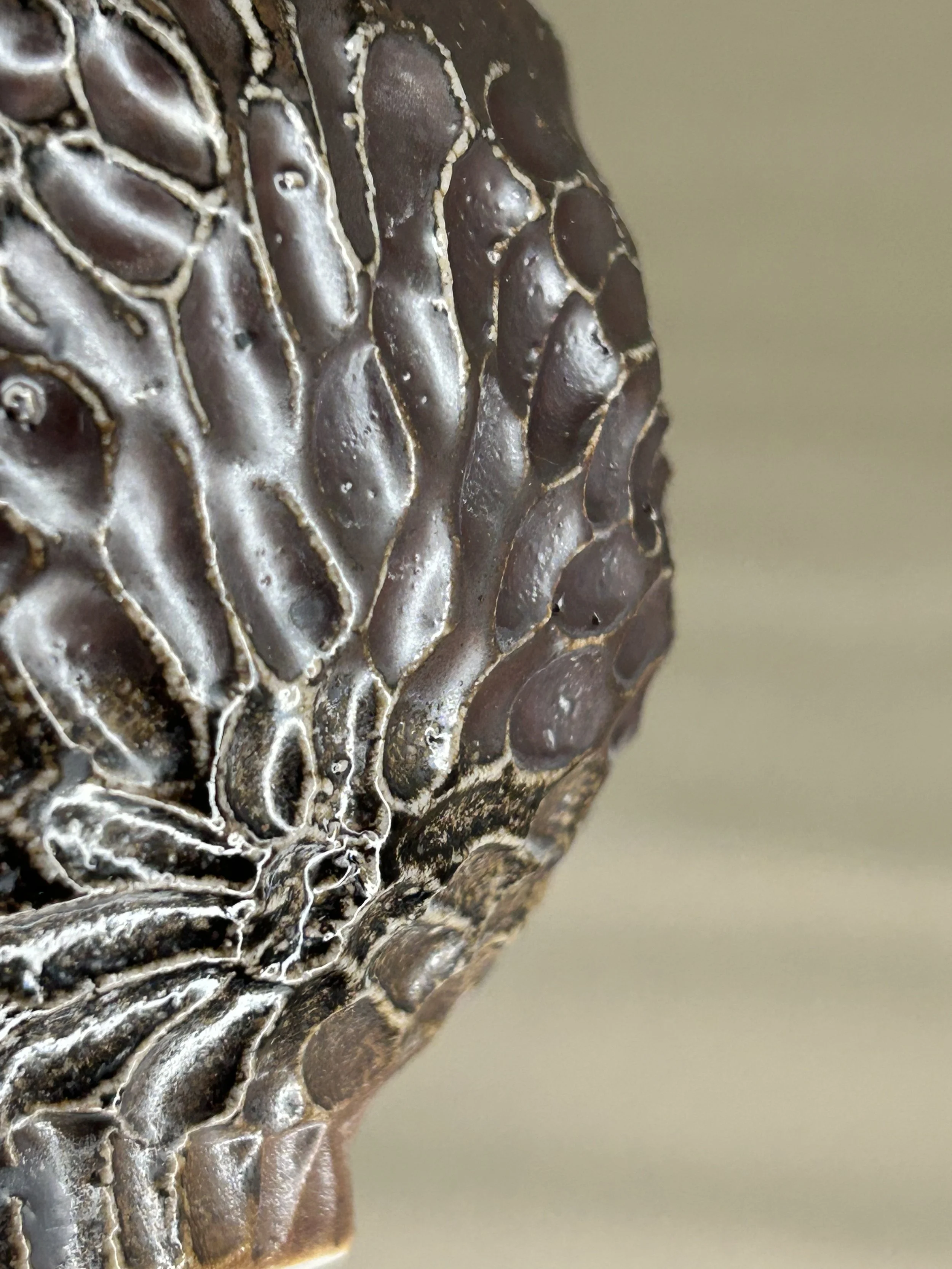 Im Handaufbau aus einer weißen Steinzeugmasse geformt und anschließend mit dem rindenartigen Muster verziert.
