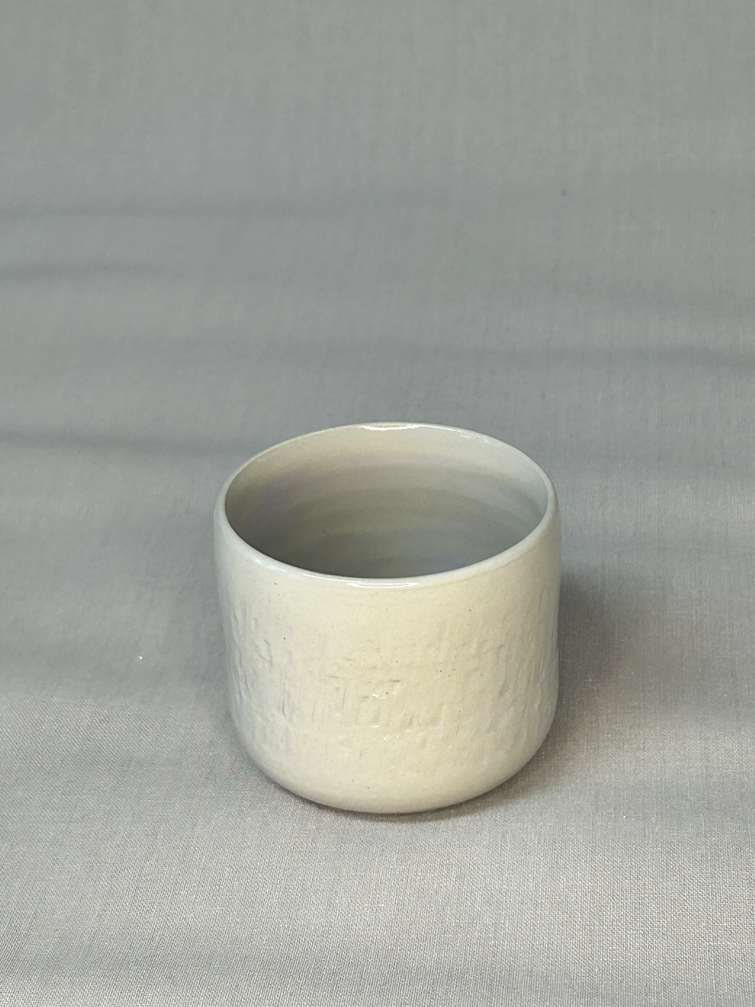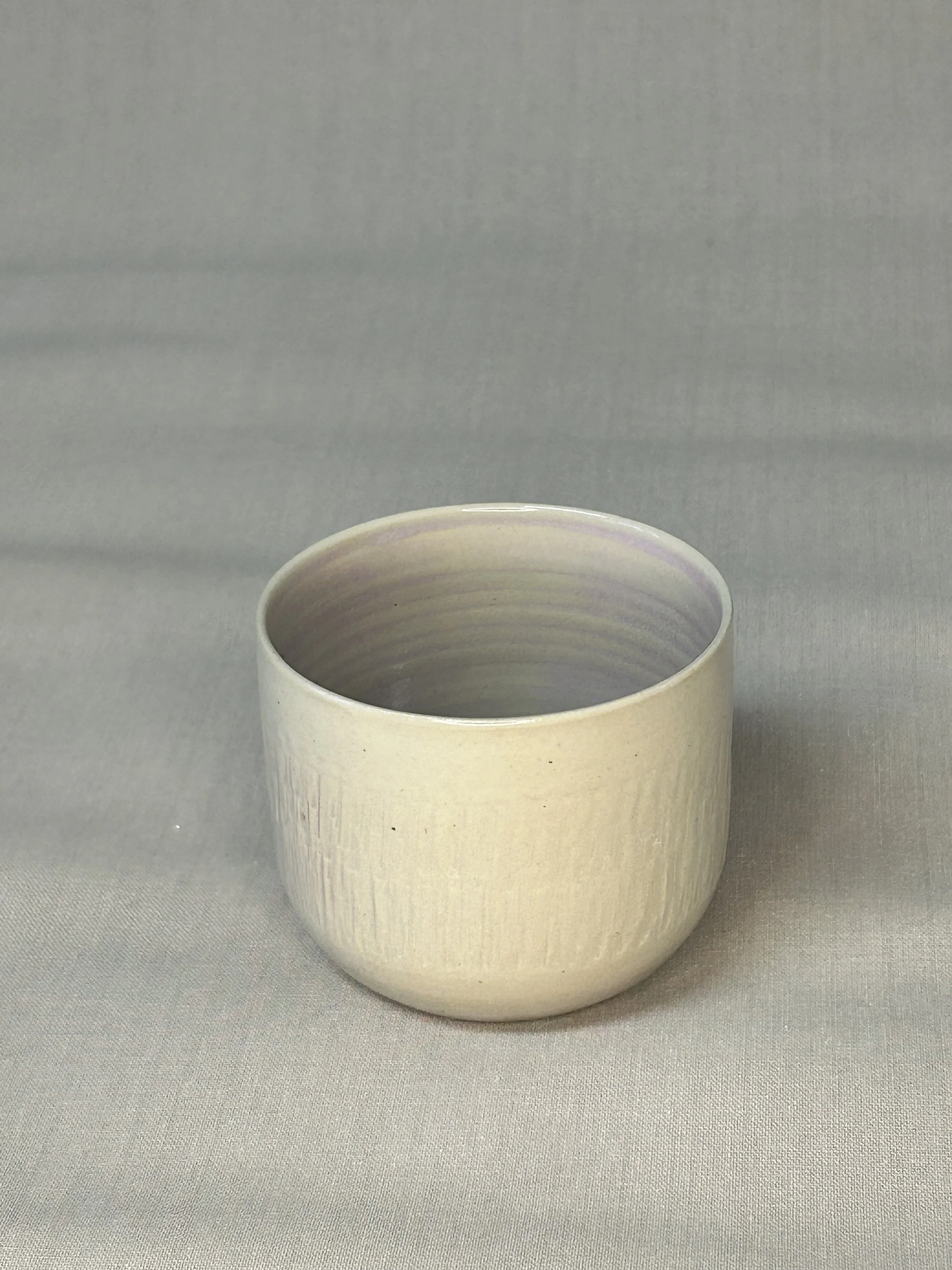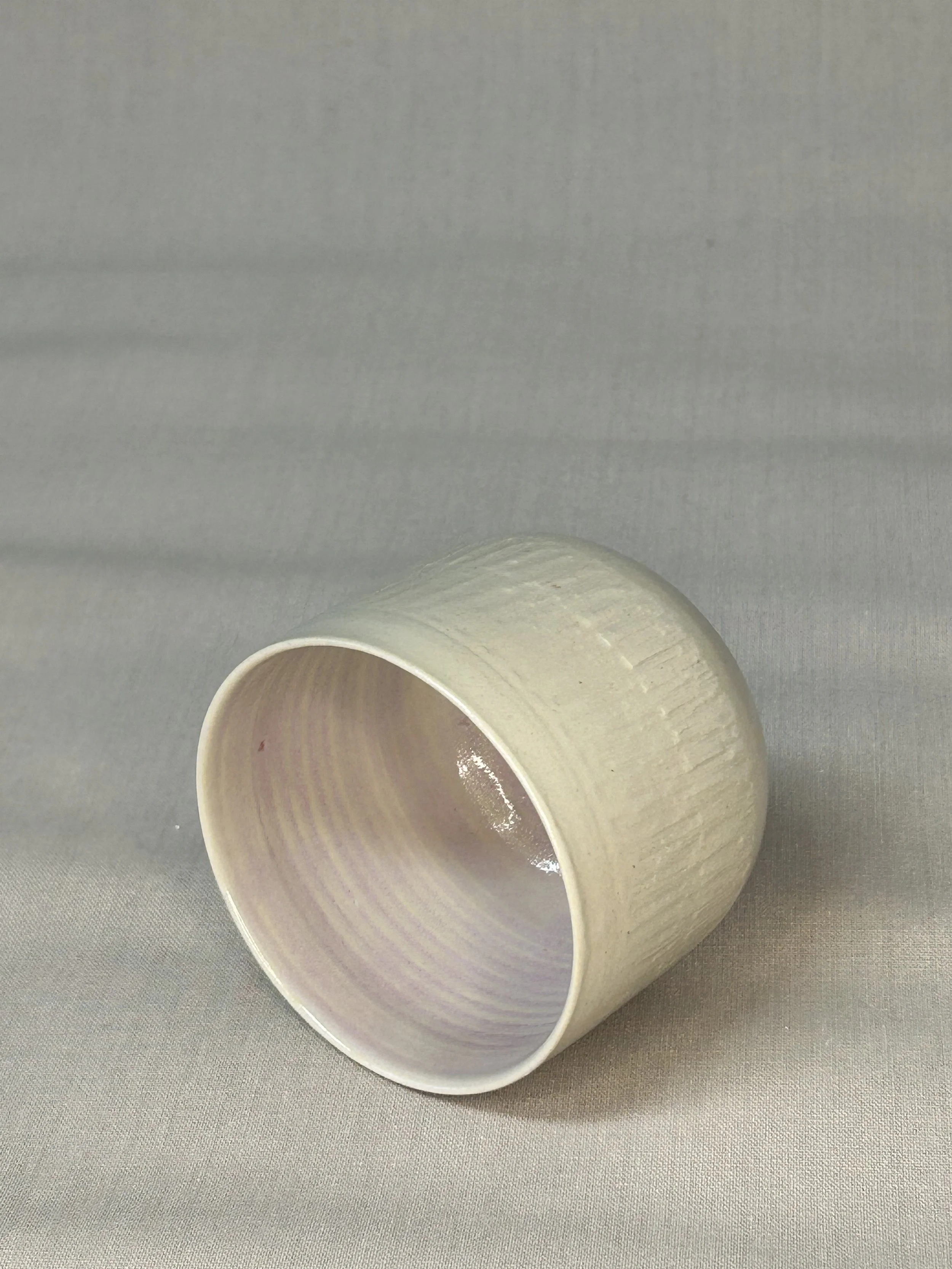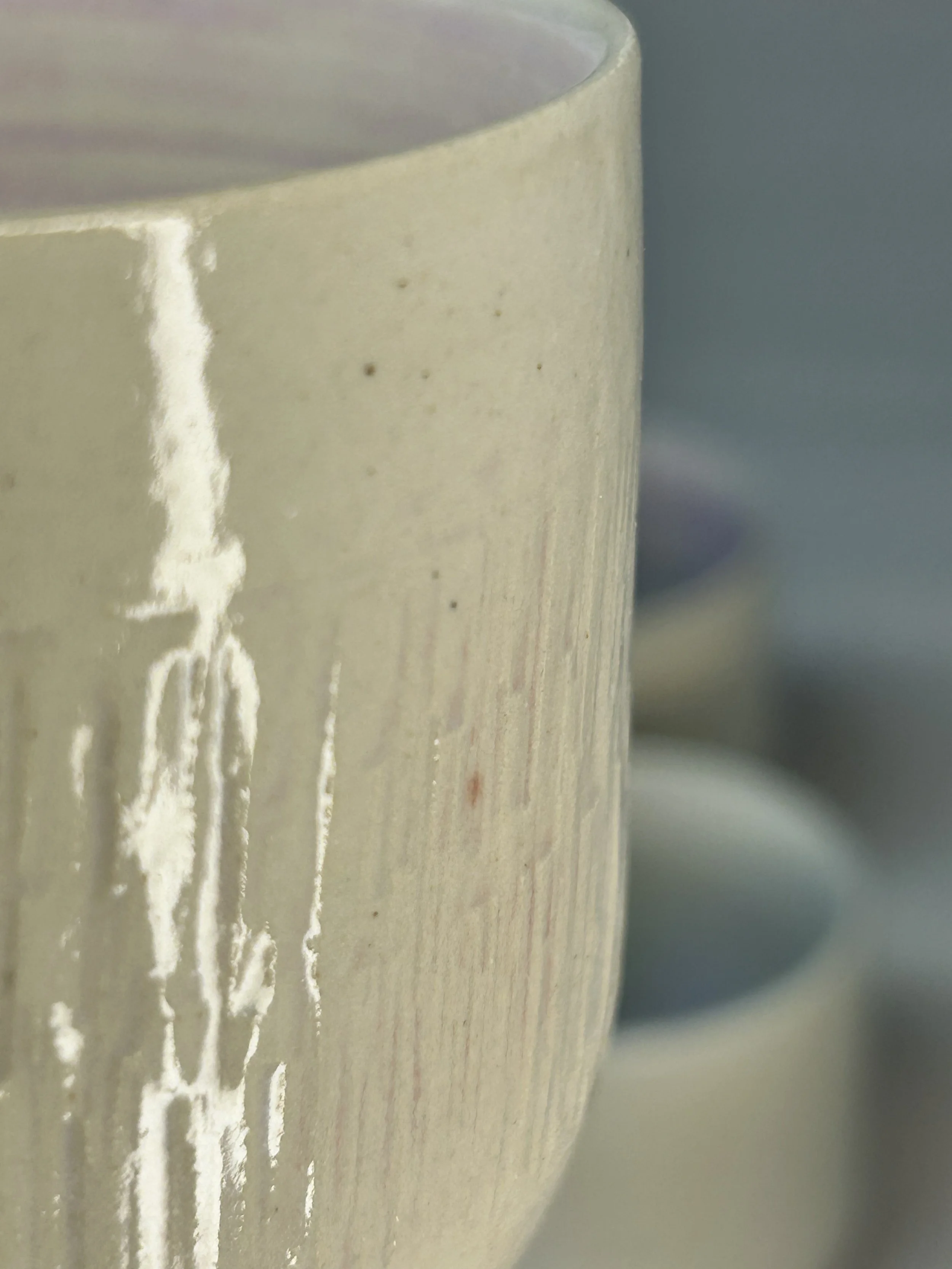 Im Handaufbau aus einer weißen Steinzeugmasse geformt und anschließend mit dem rindenartigen Muster verziert.