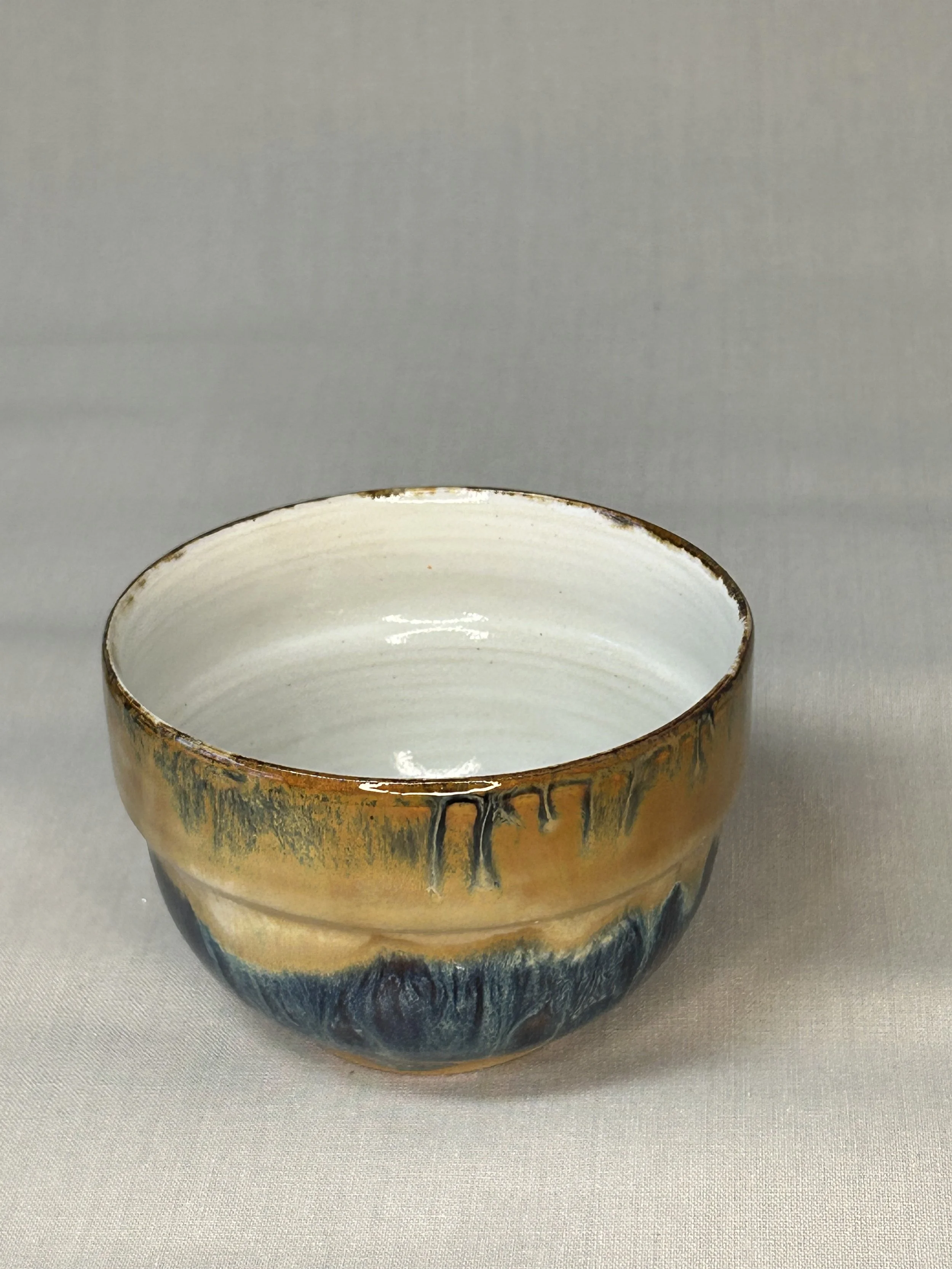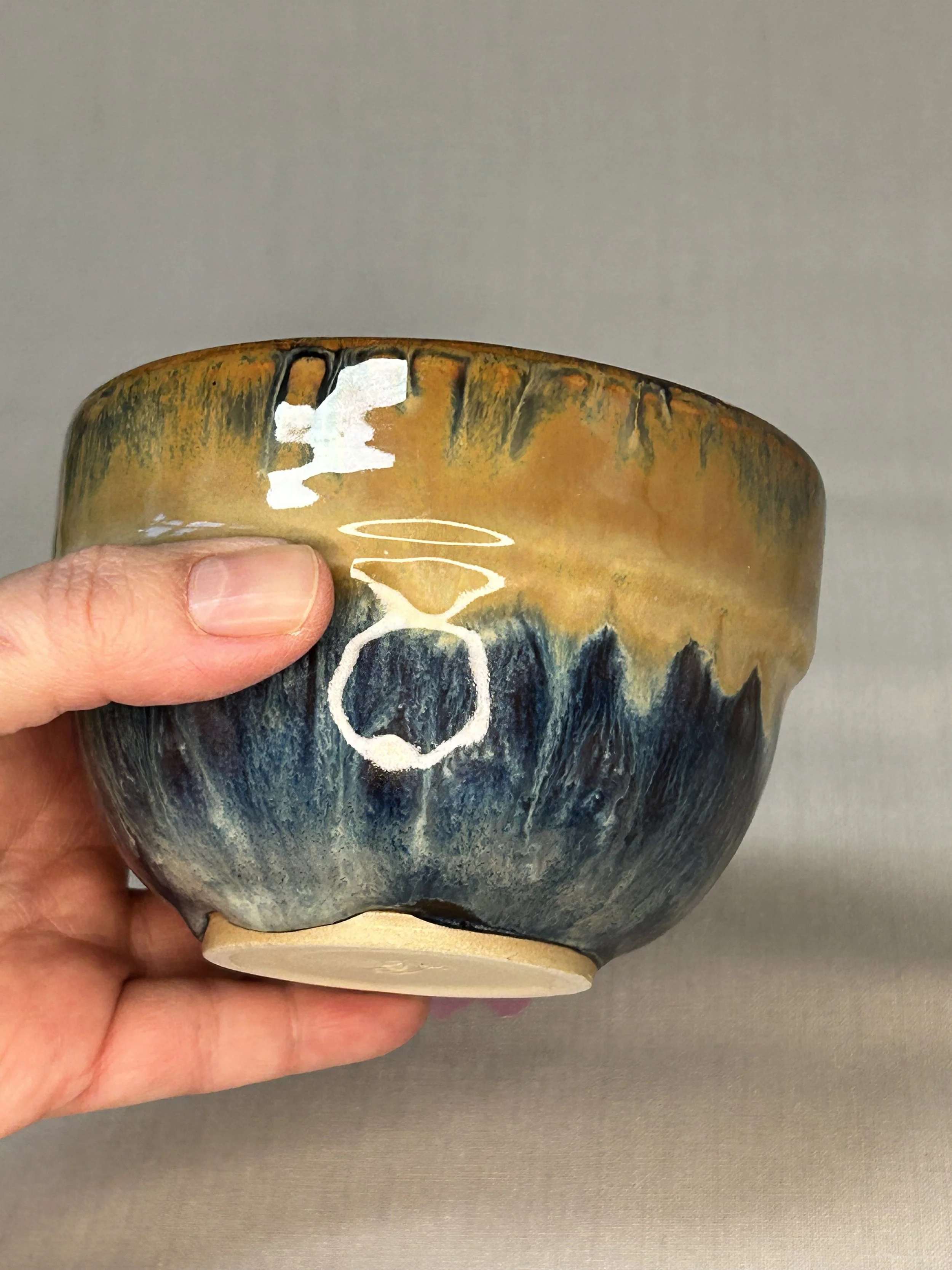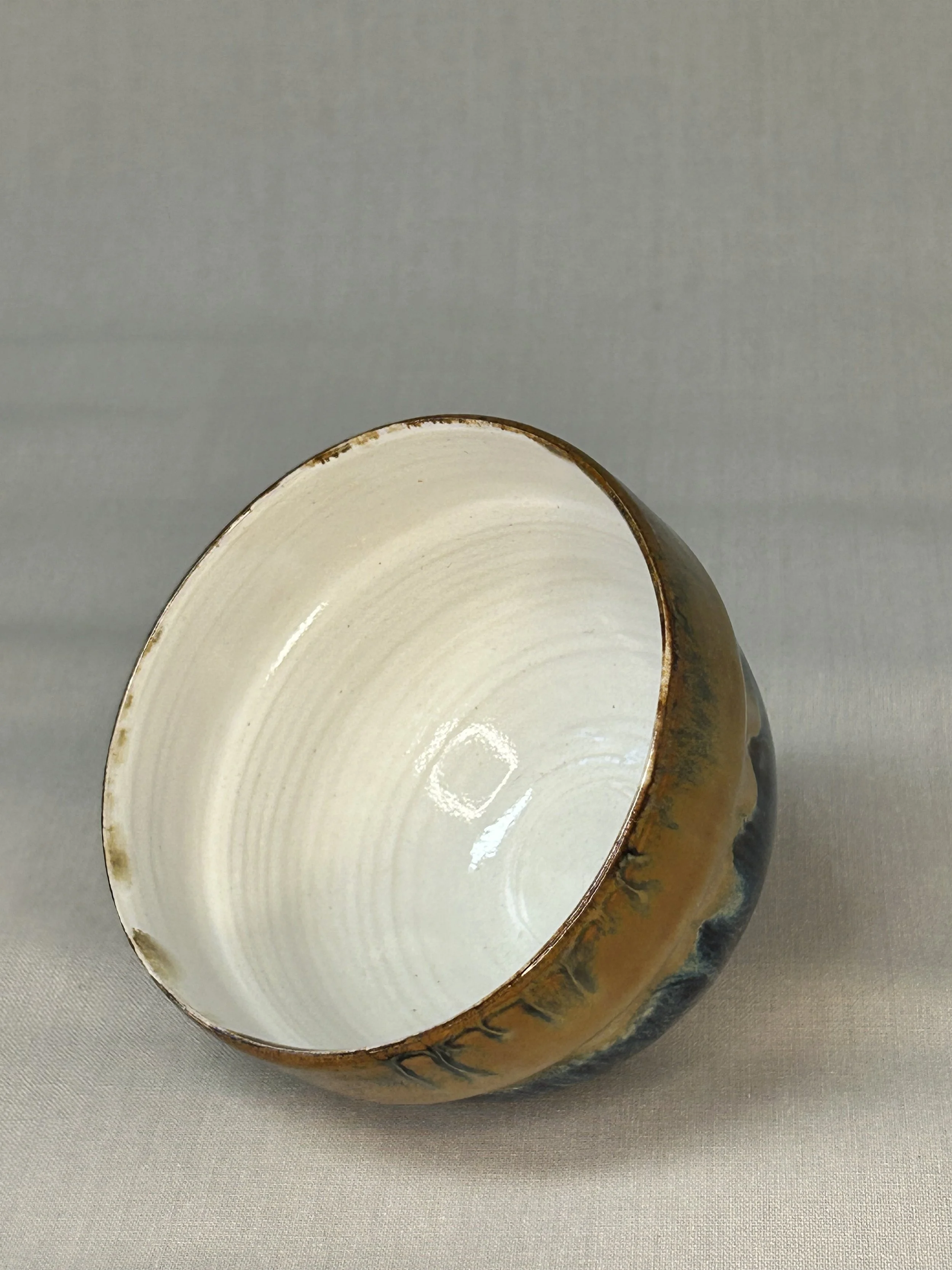 Die einzigartigen Glasureffekte entstehen durch den Flug von Asche, die Postion der Keramik im Ofen und die Hinzugabe von Salz während des Brands. Innen mit einer Shino-Glasur glasiert.