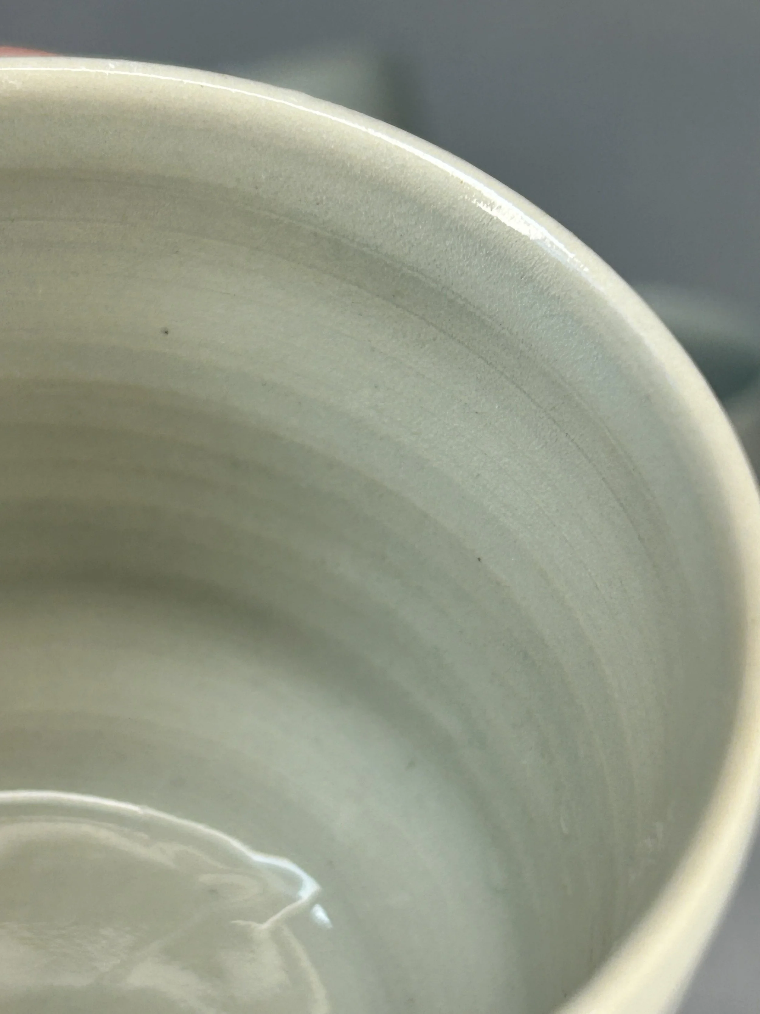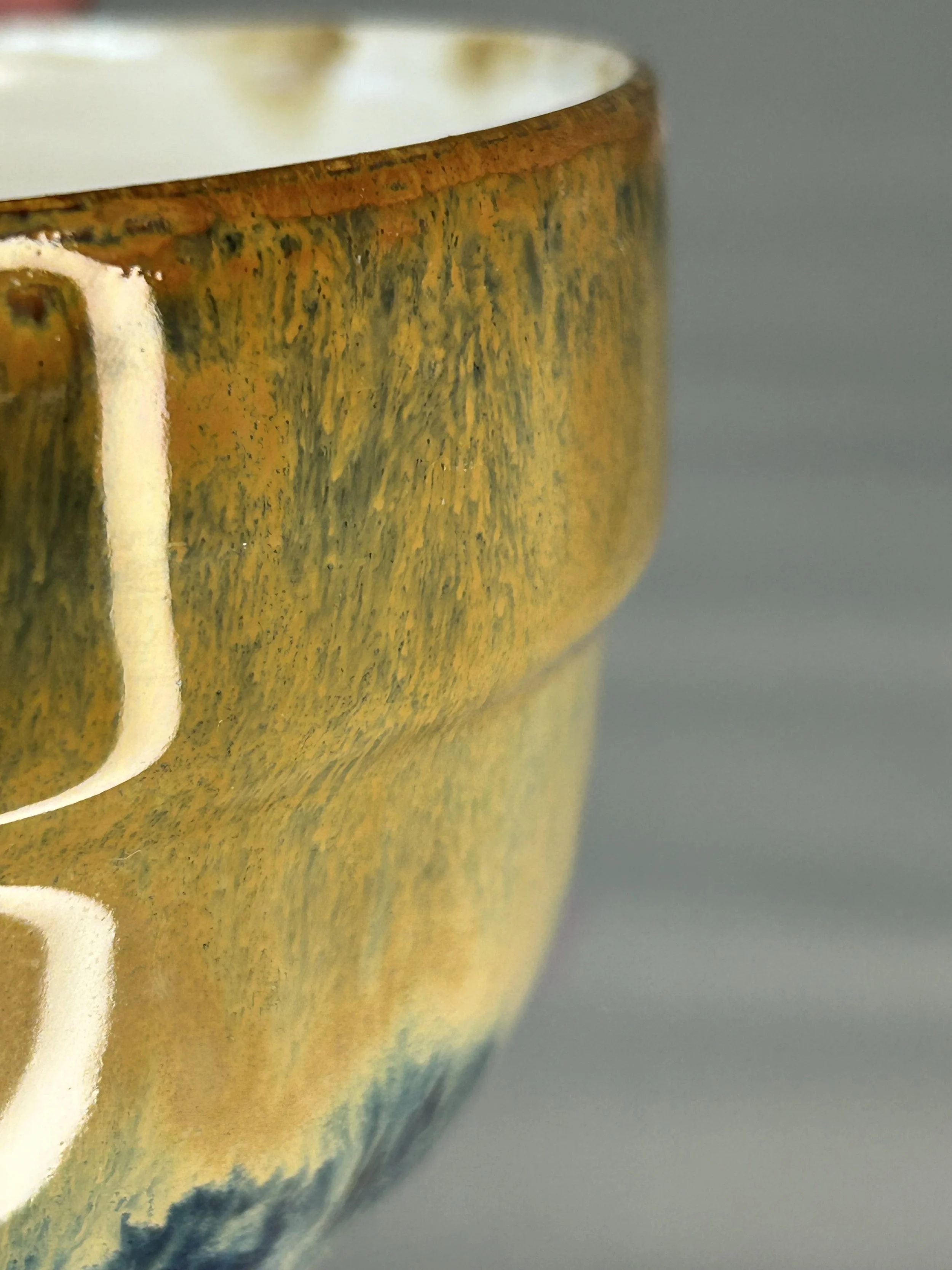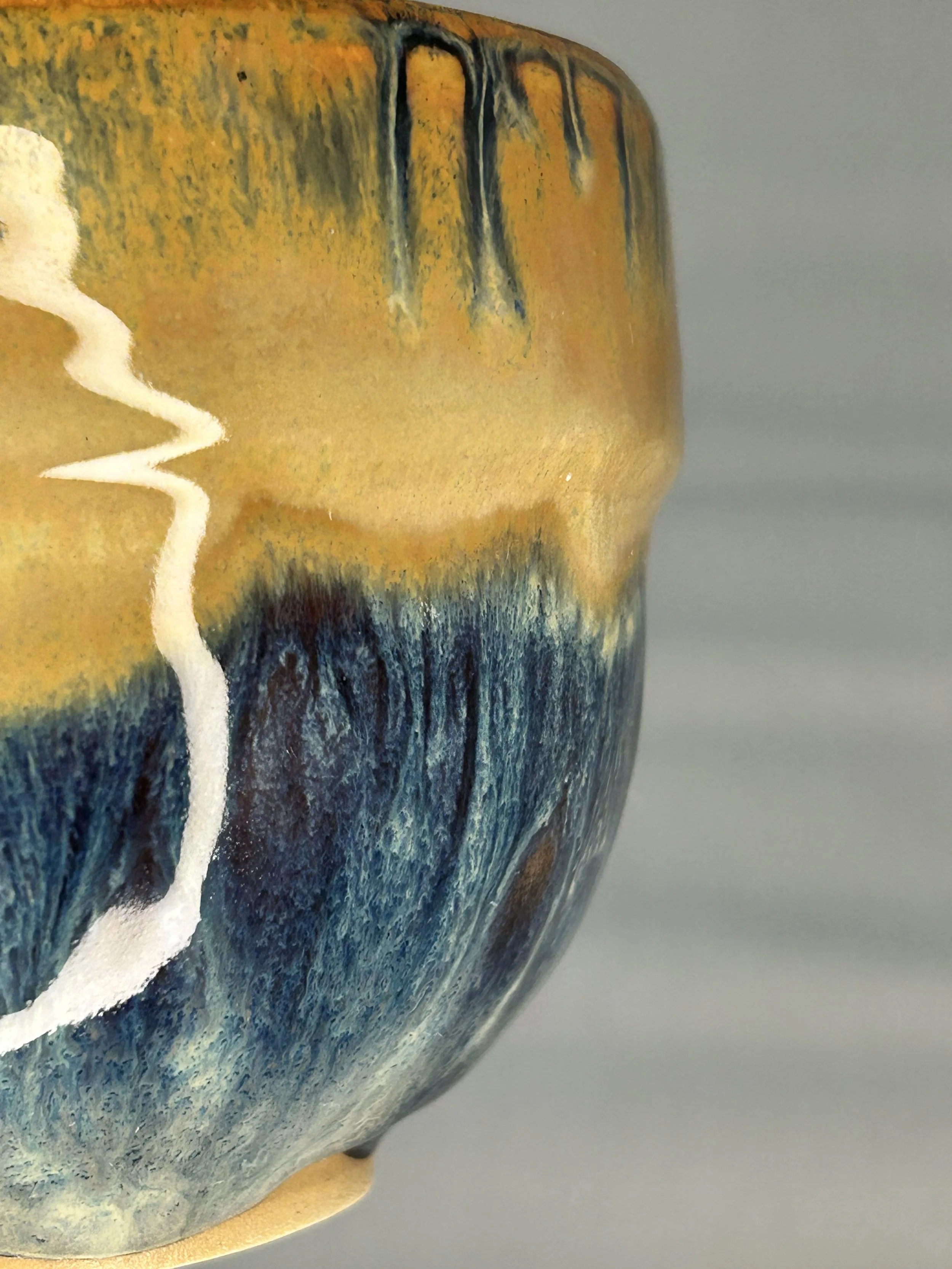 Die einzigartigen Glasureffekte entstehen durch den Flug von Asche, die Postion der Keramik im Ofen und die Hinzugabe von Salz während des Brands. Innen mit einer Shino-Glasur glasiert.