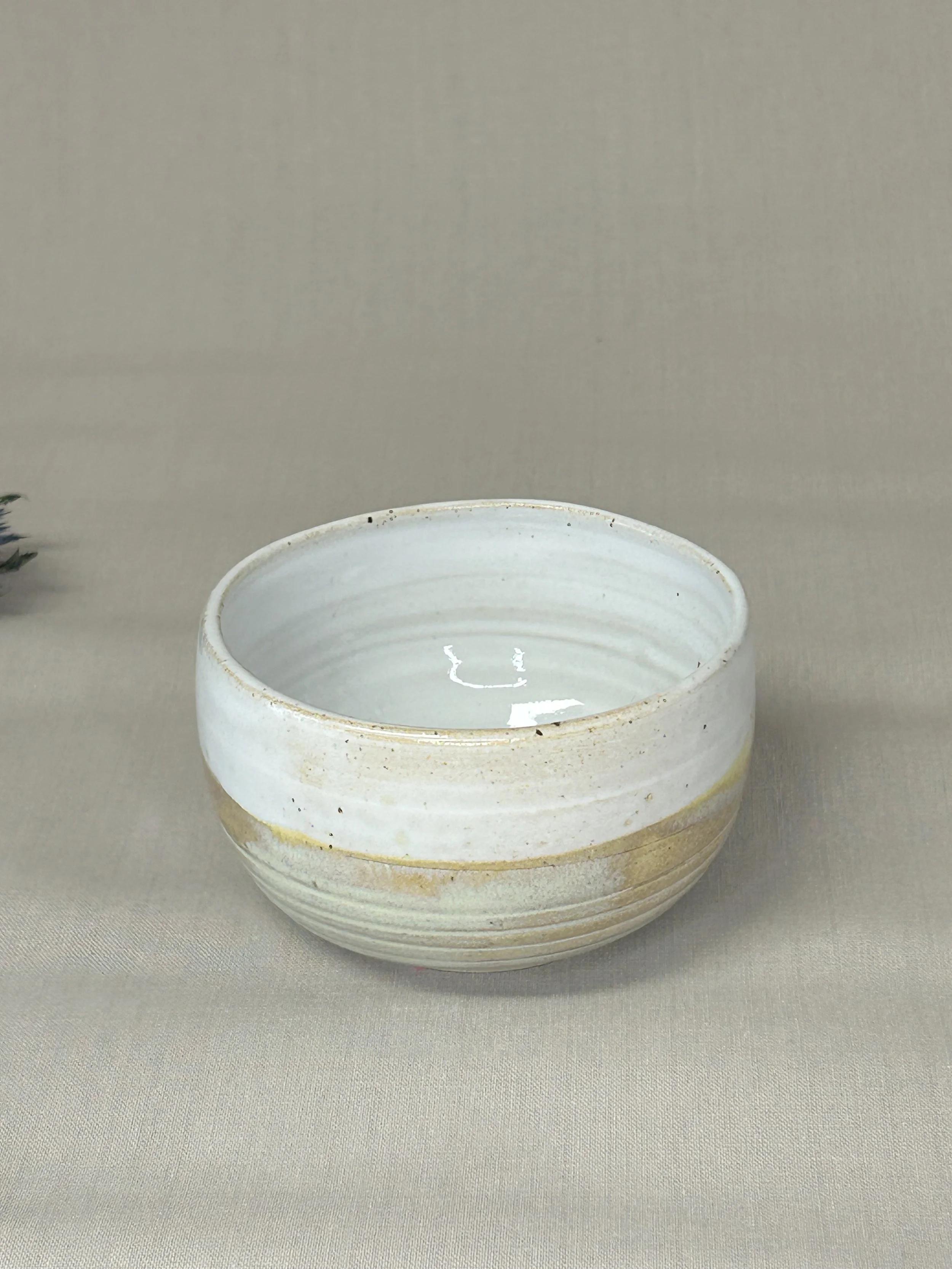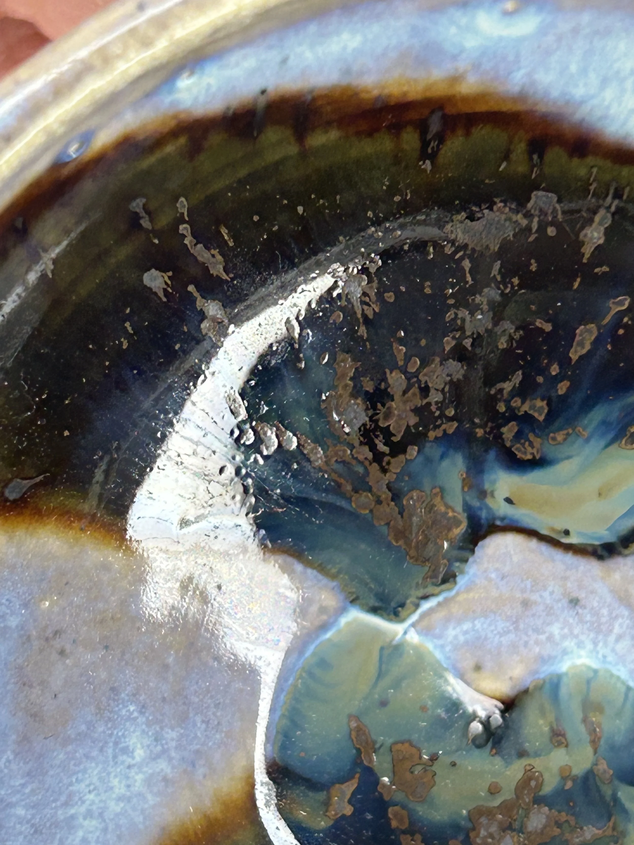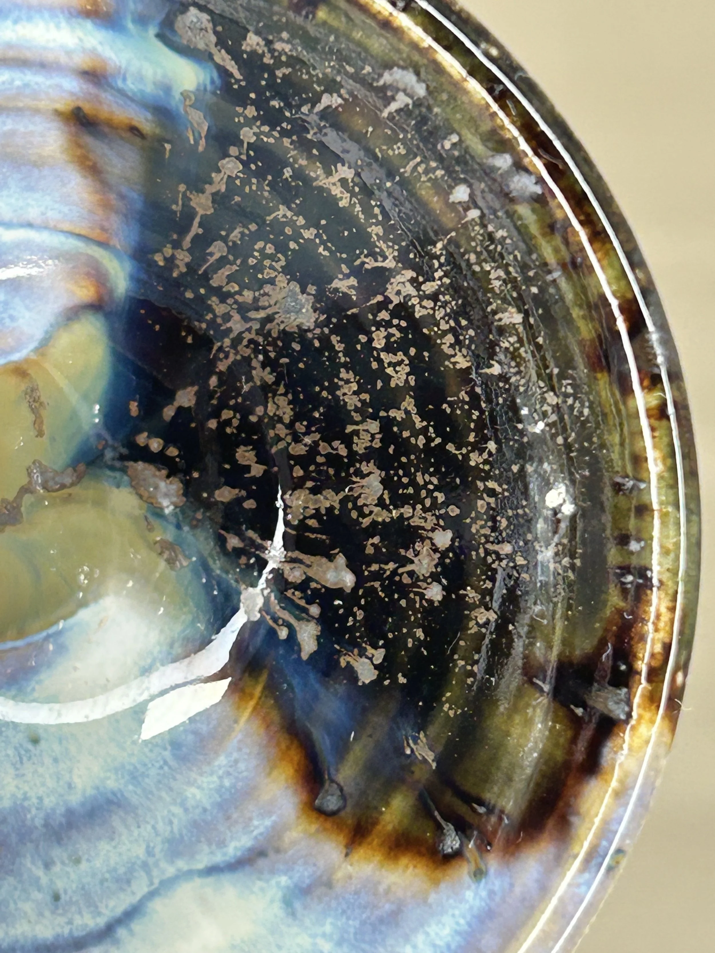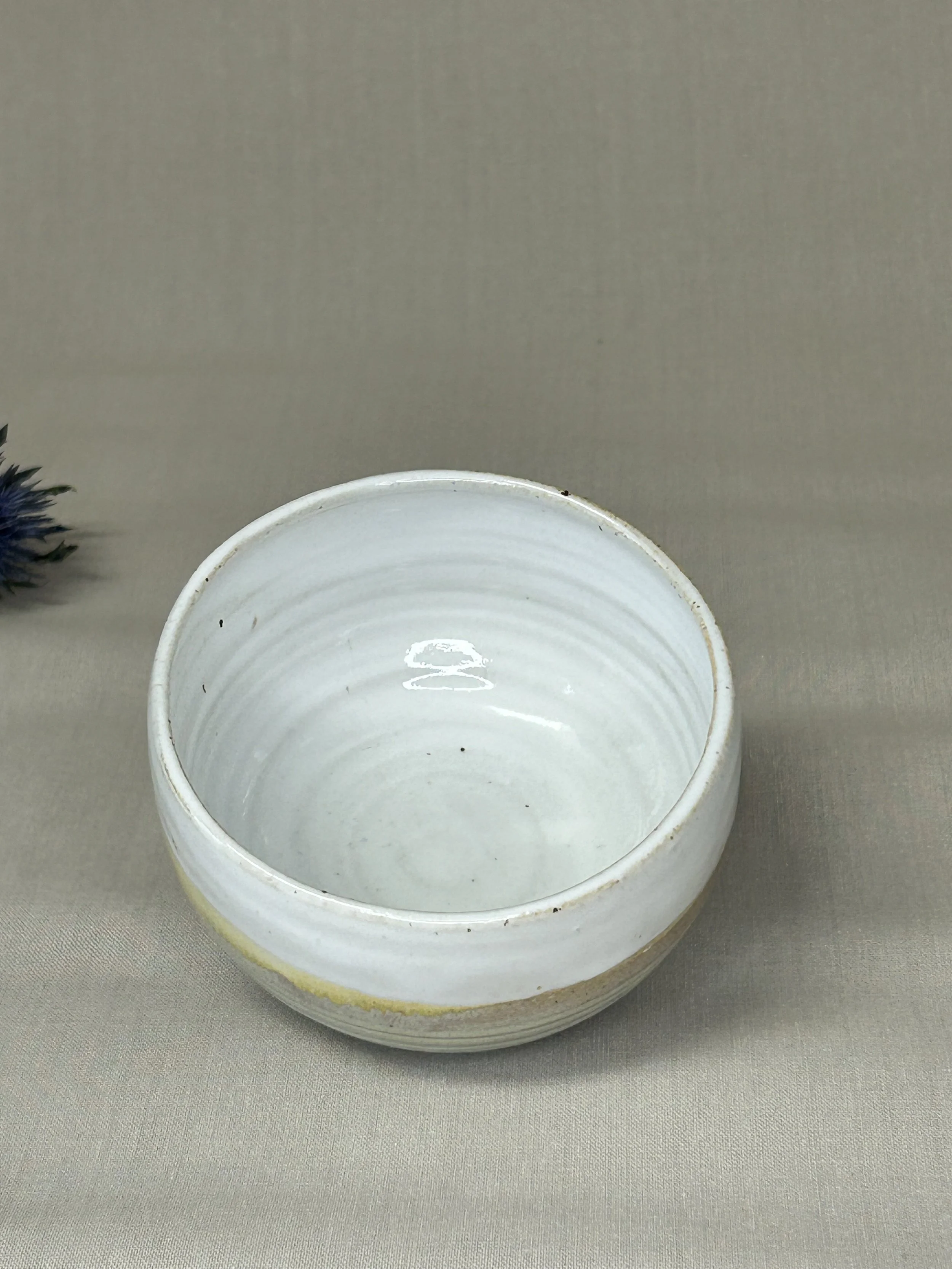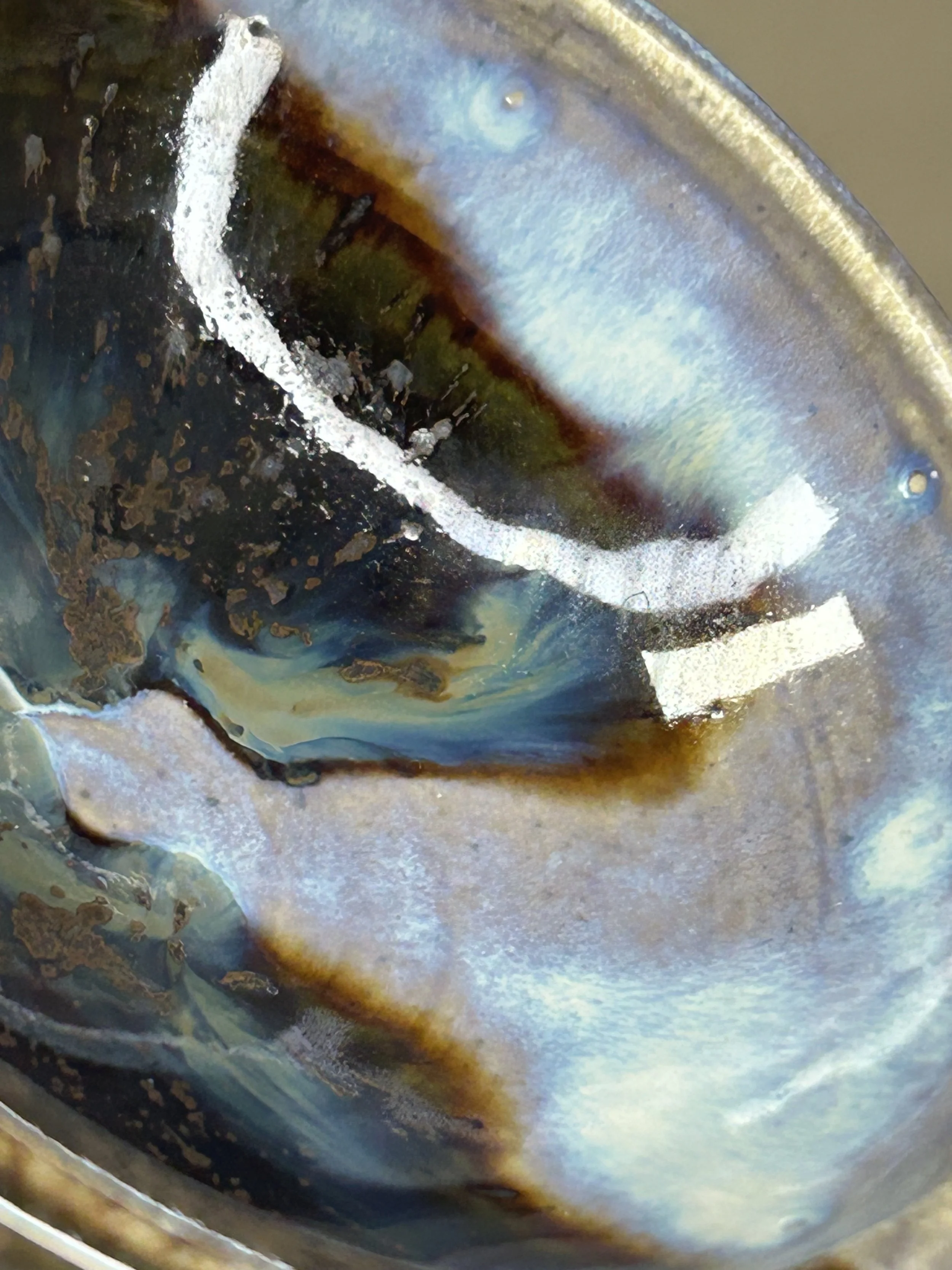 Fein gedreht aus einer hellgrauen, leicht gespotteten Steinzeugmasse. Außen unglasiert, innen chinarote Effektglasur.