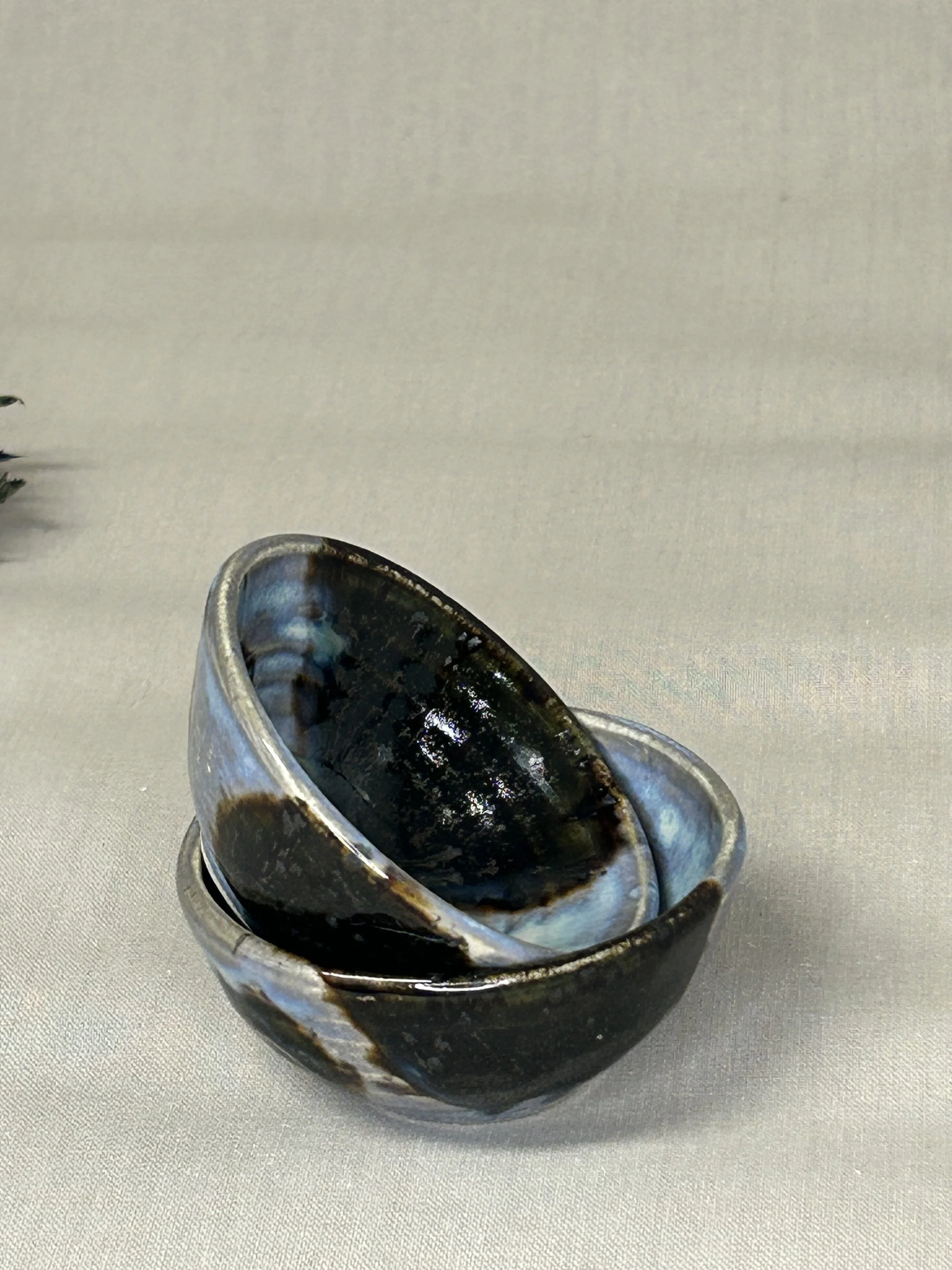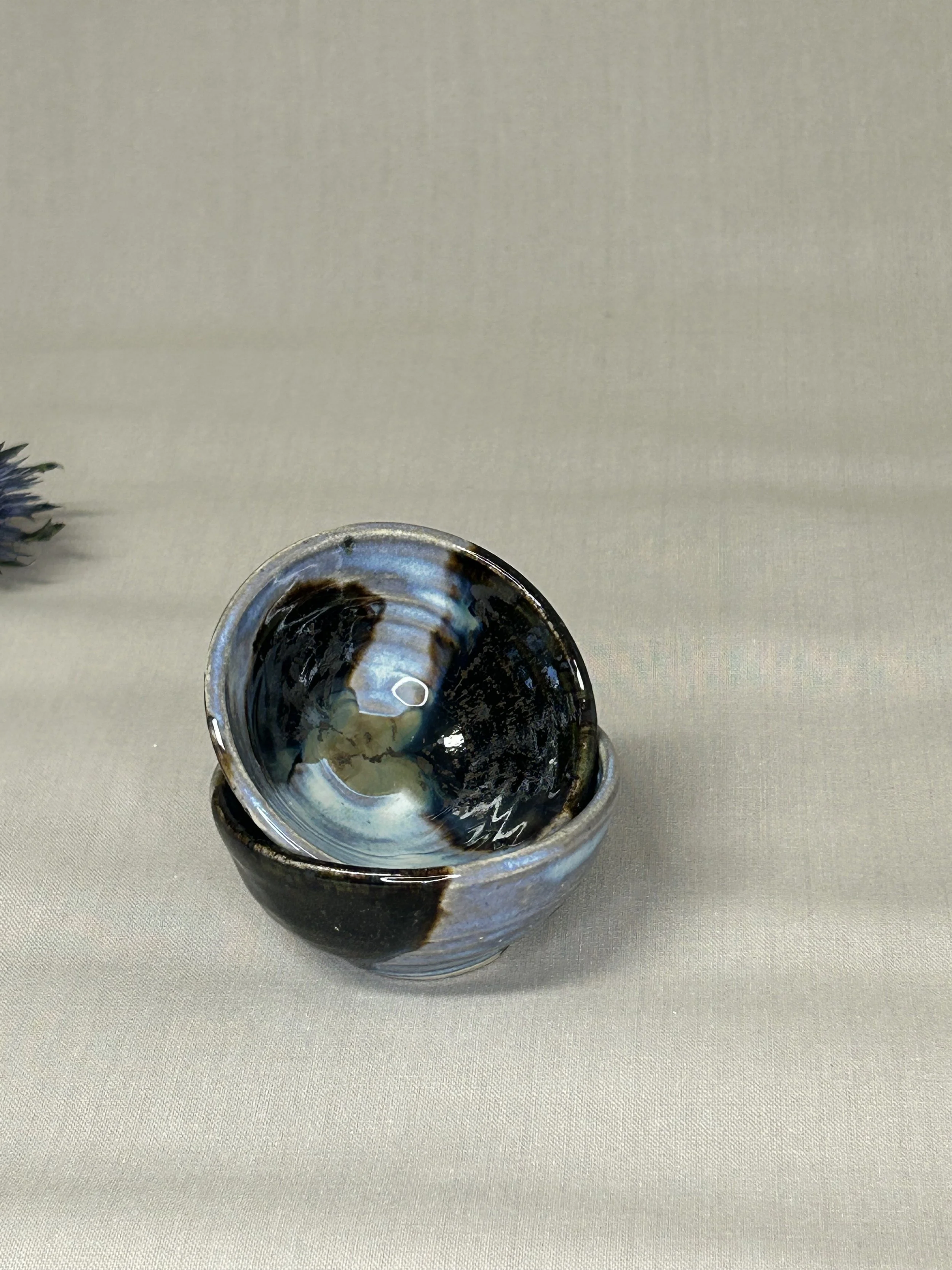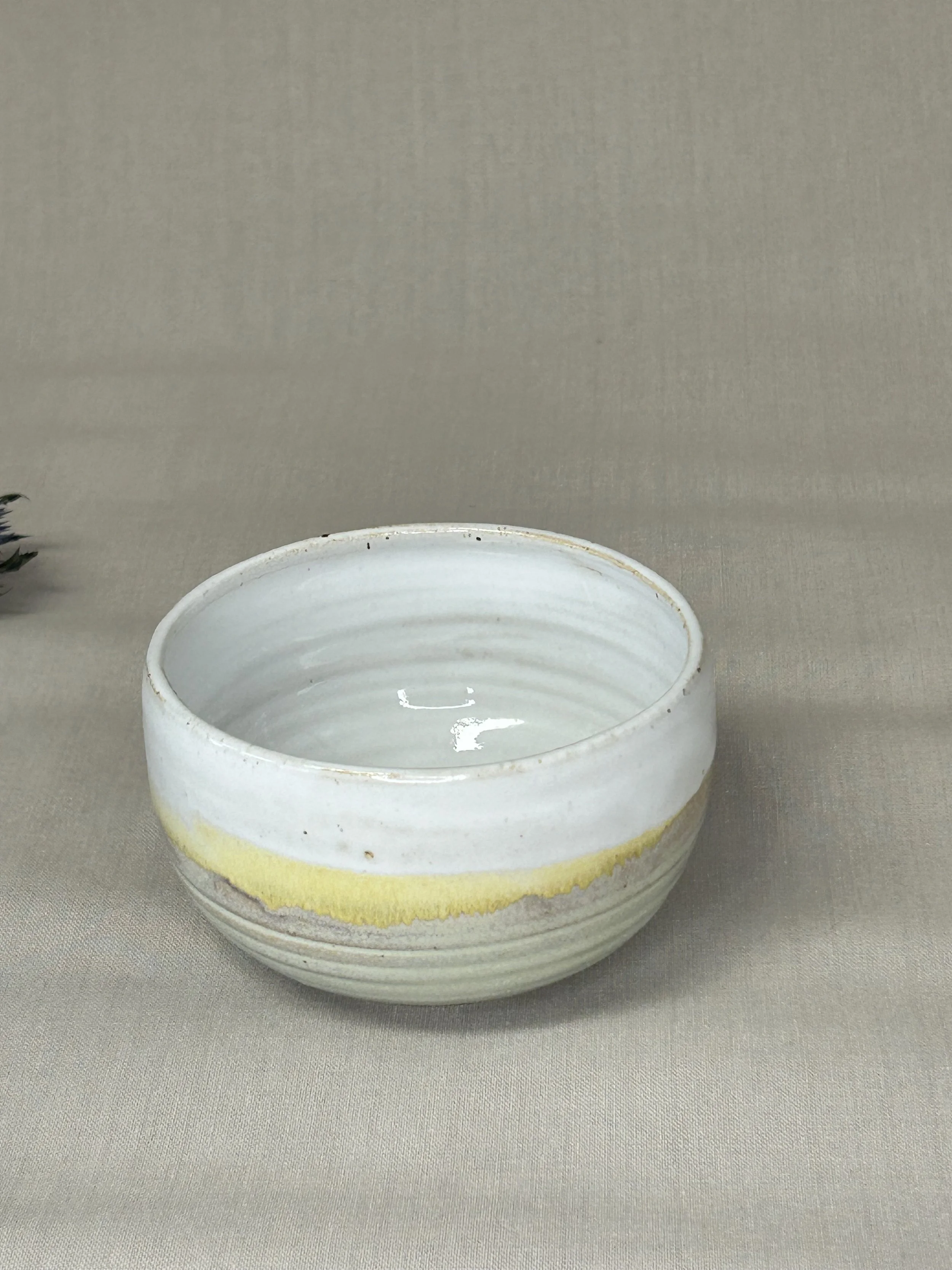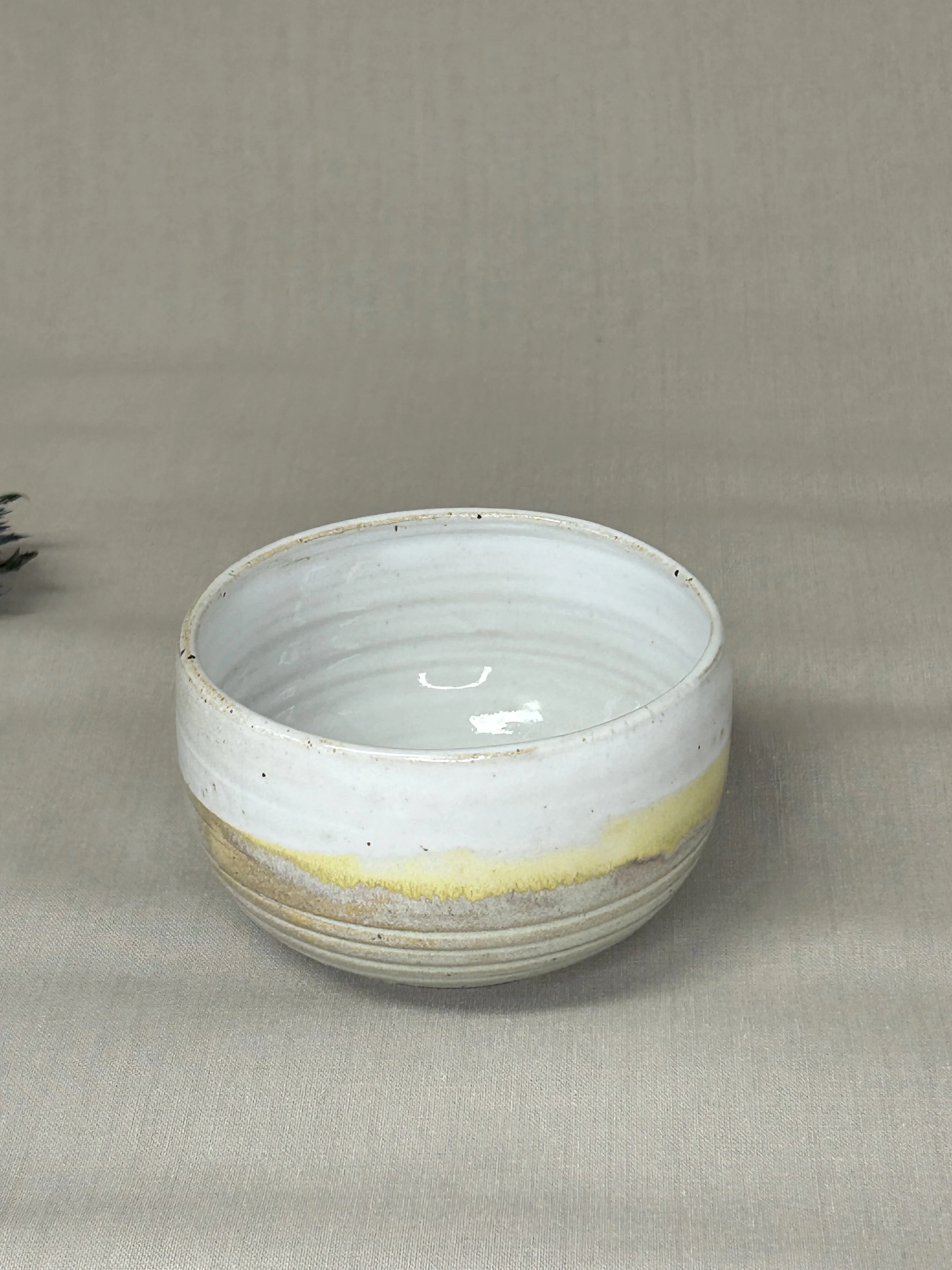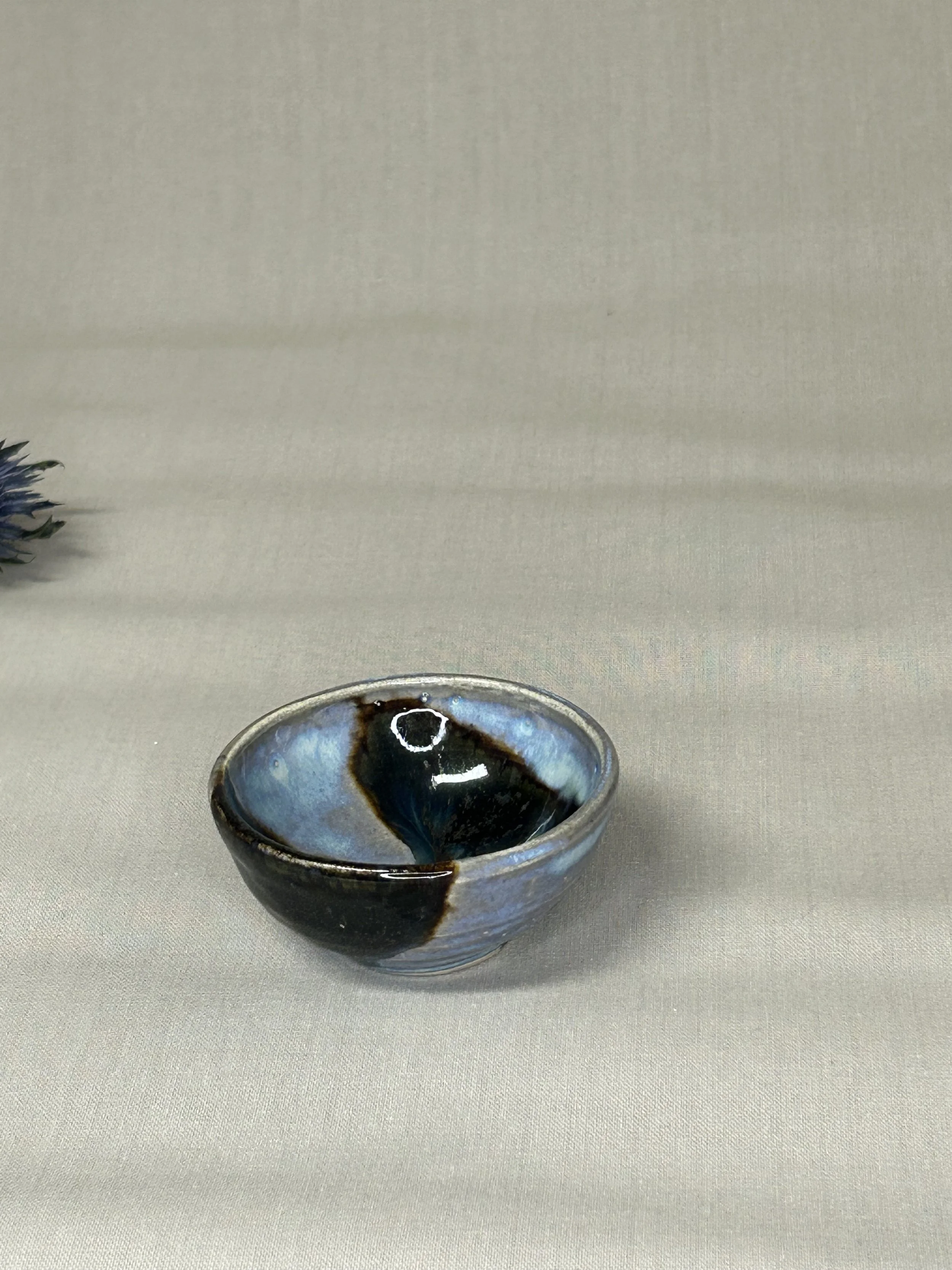 Fein gedreht aus einer hellgrauen, leicht gespotteten Steinzeugmasse. Außen unglasiert, innen chinarote Effektglasur.