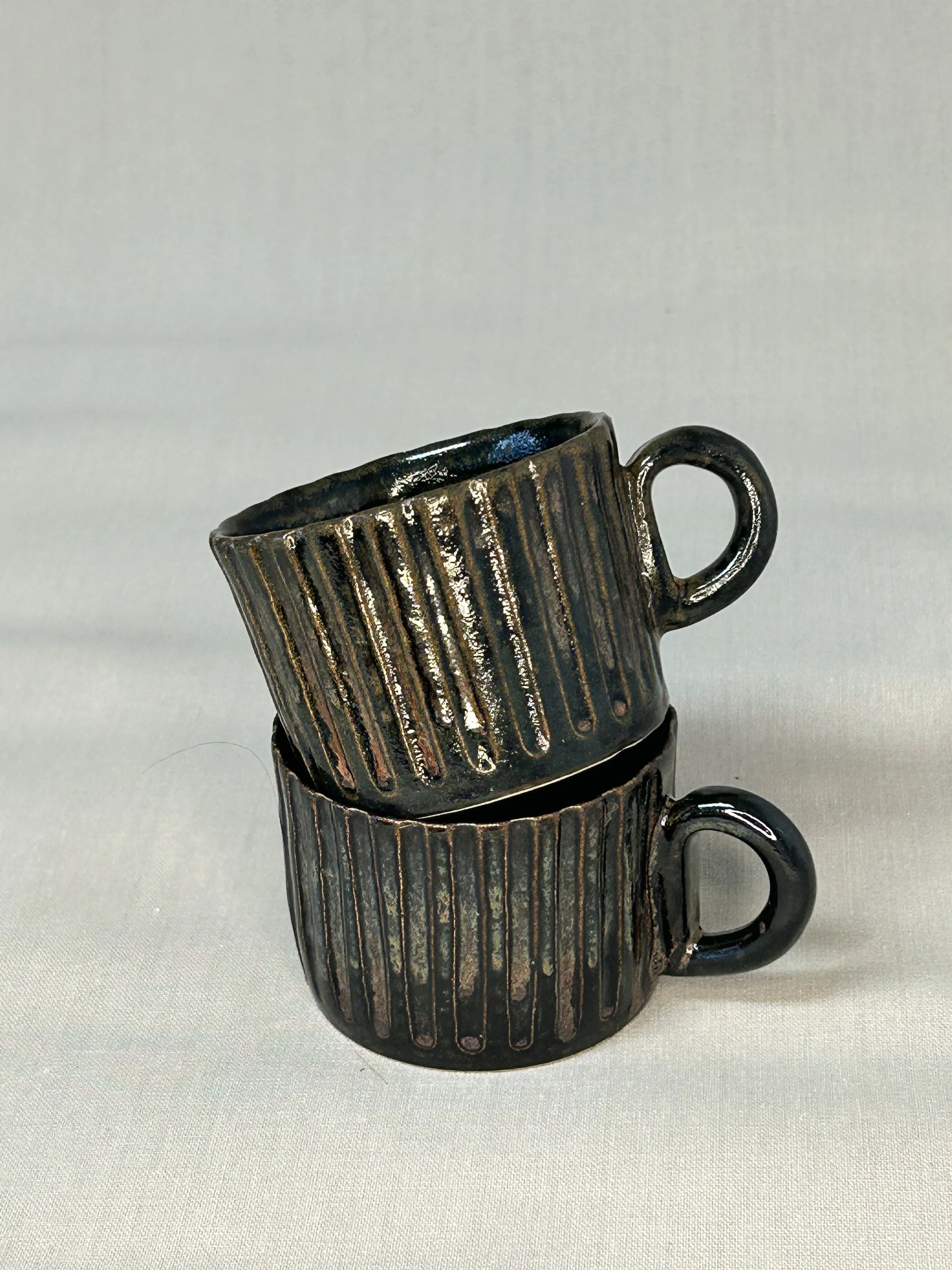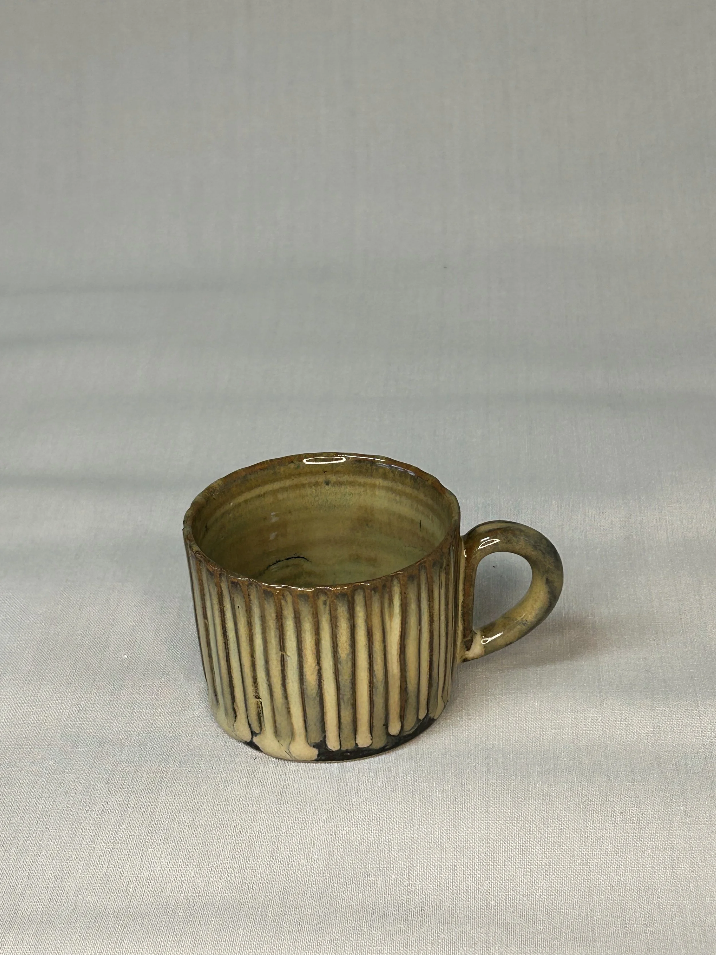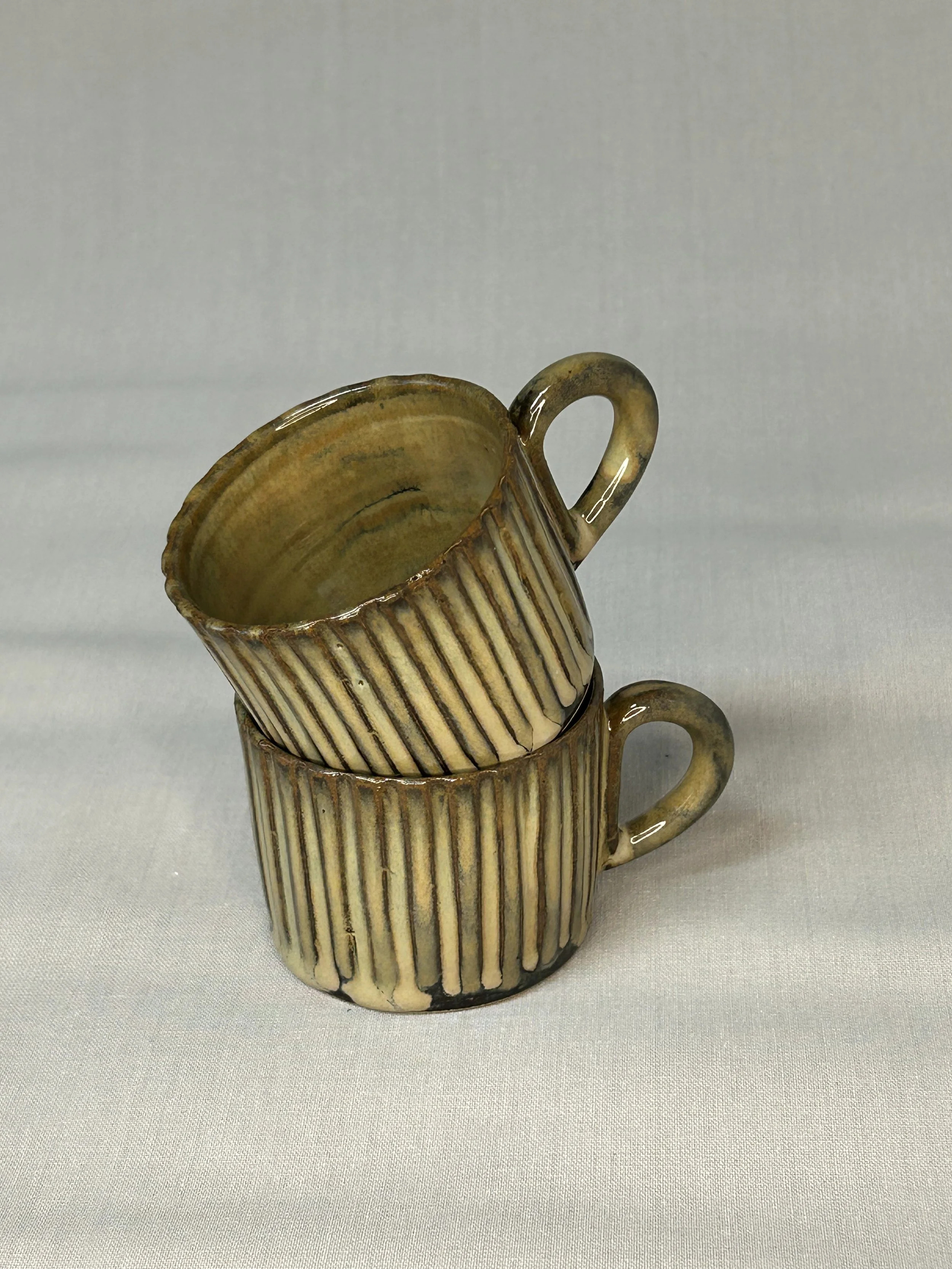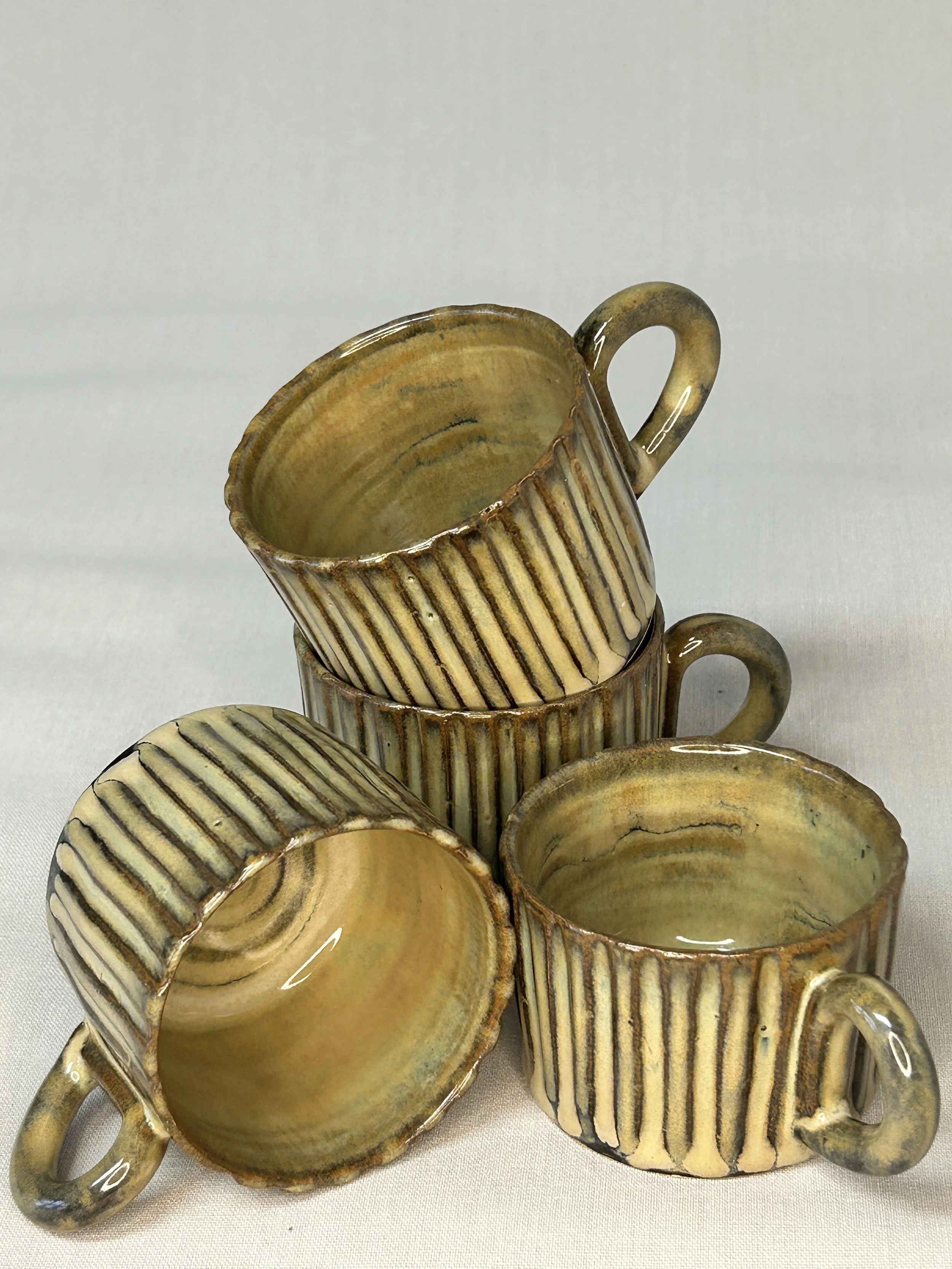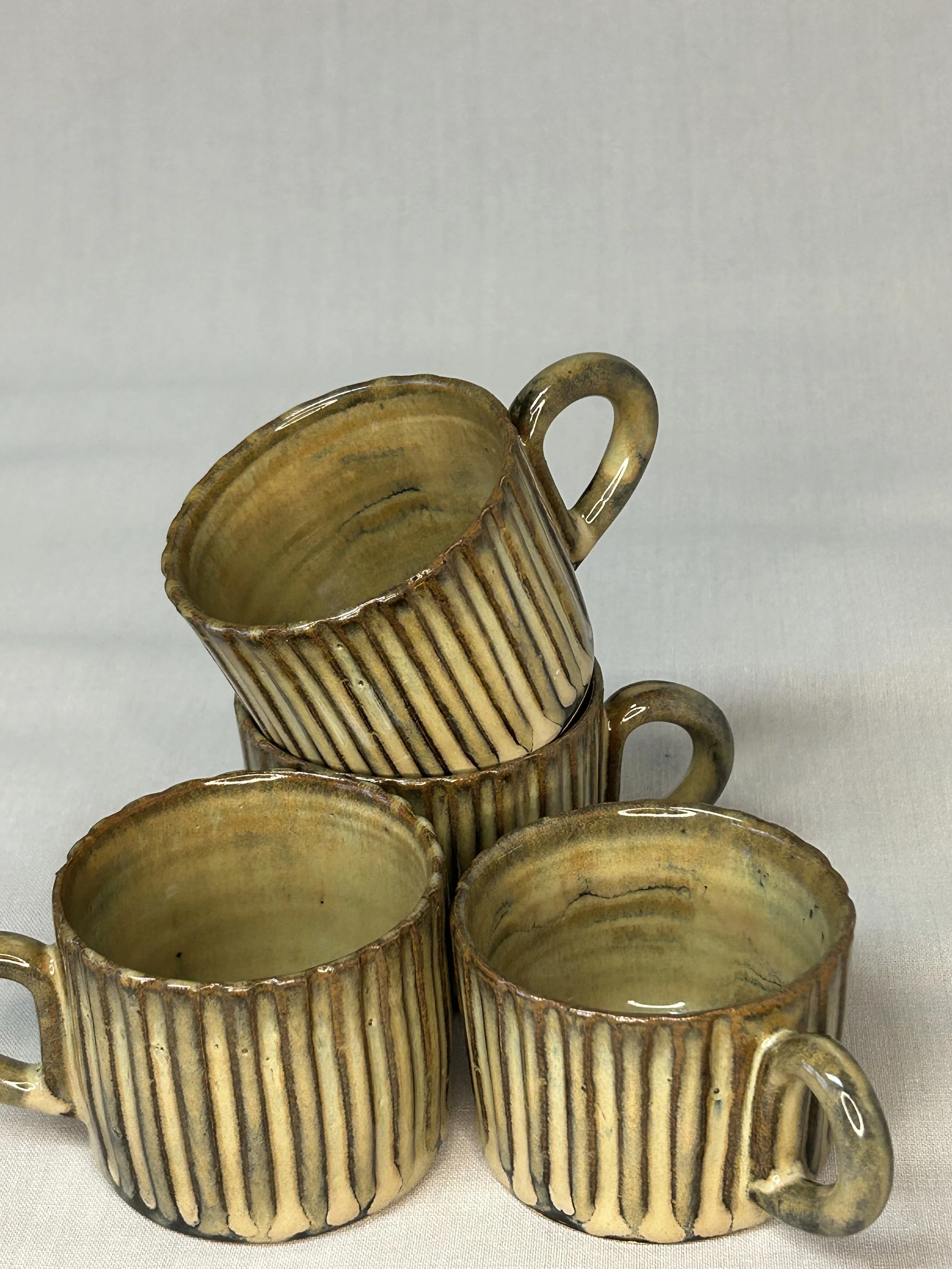 Die mittelgroßen Tassen sind mit feinen Shattering-Mustern verziert, die weiße Glasur bringt sie zum Vorschein; die grüne Glasur zeigt kleine punktförmige Effekte.