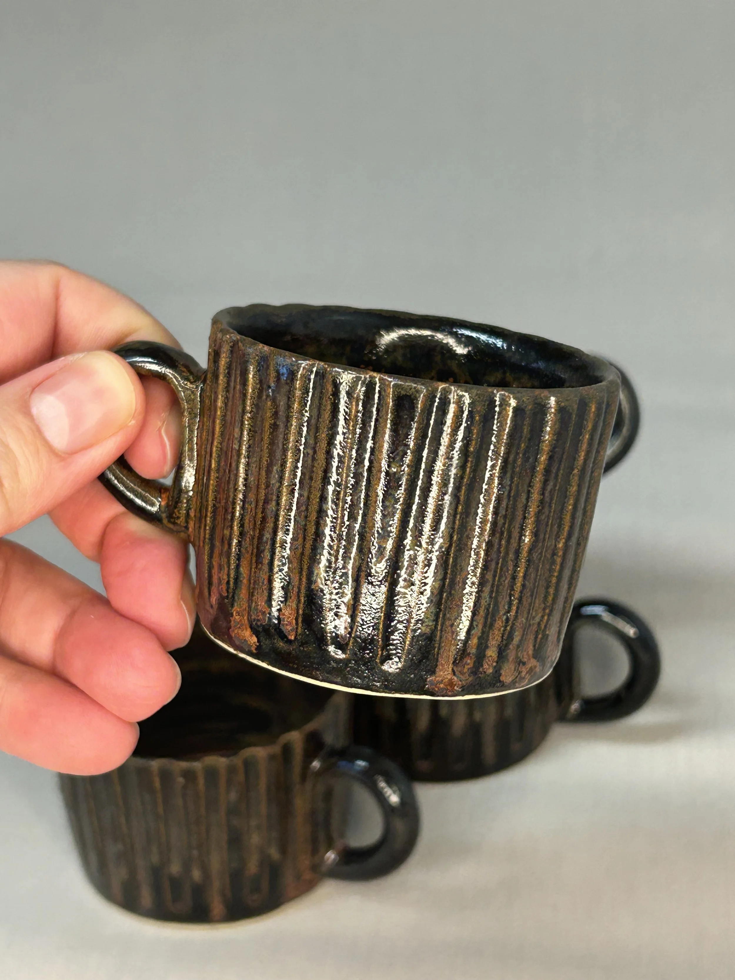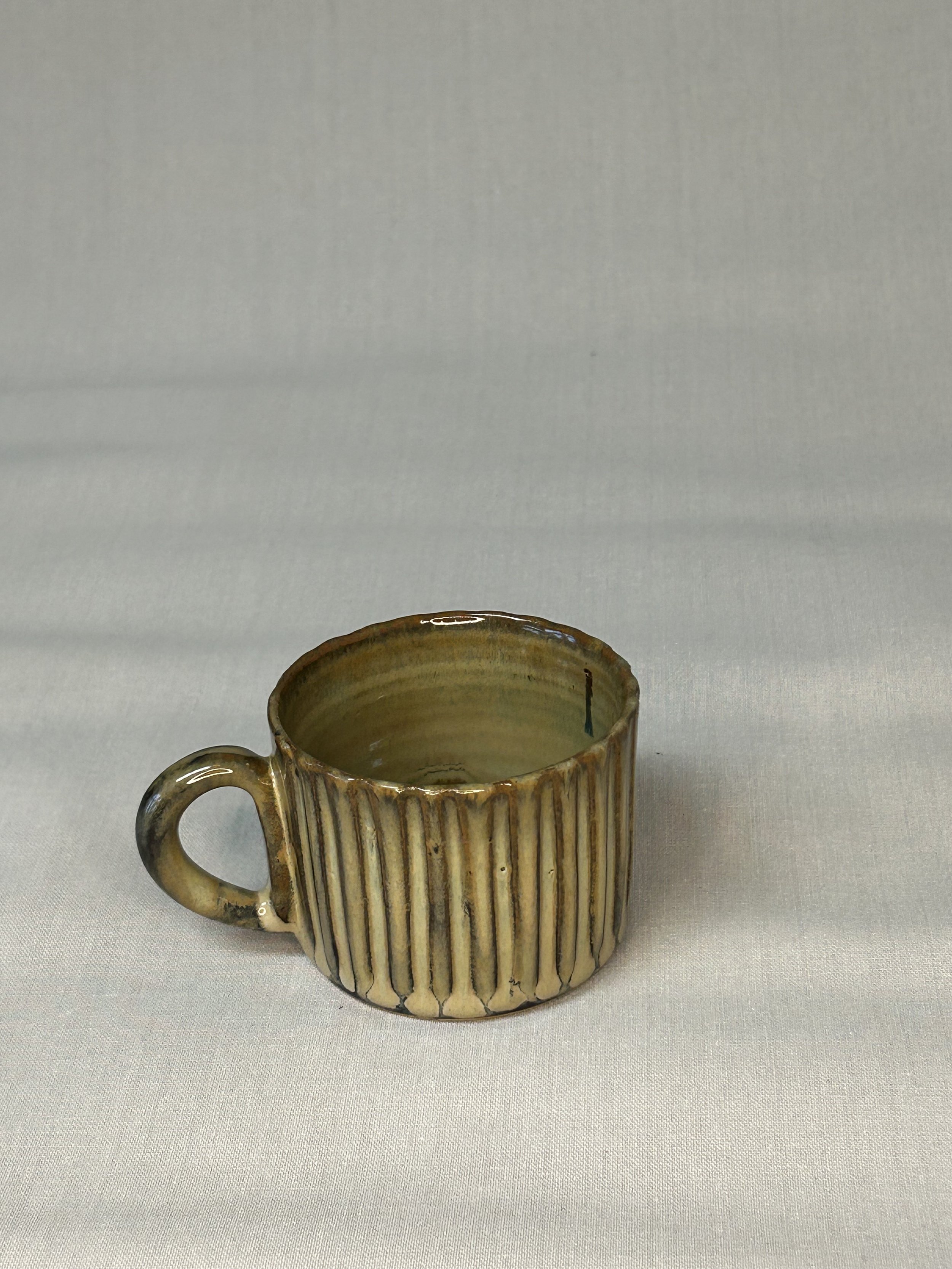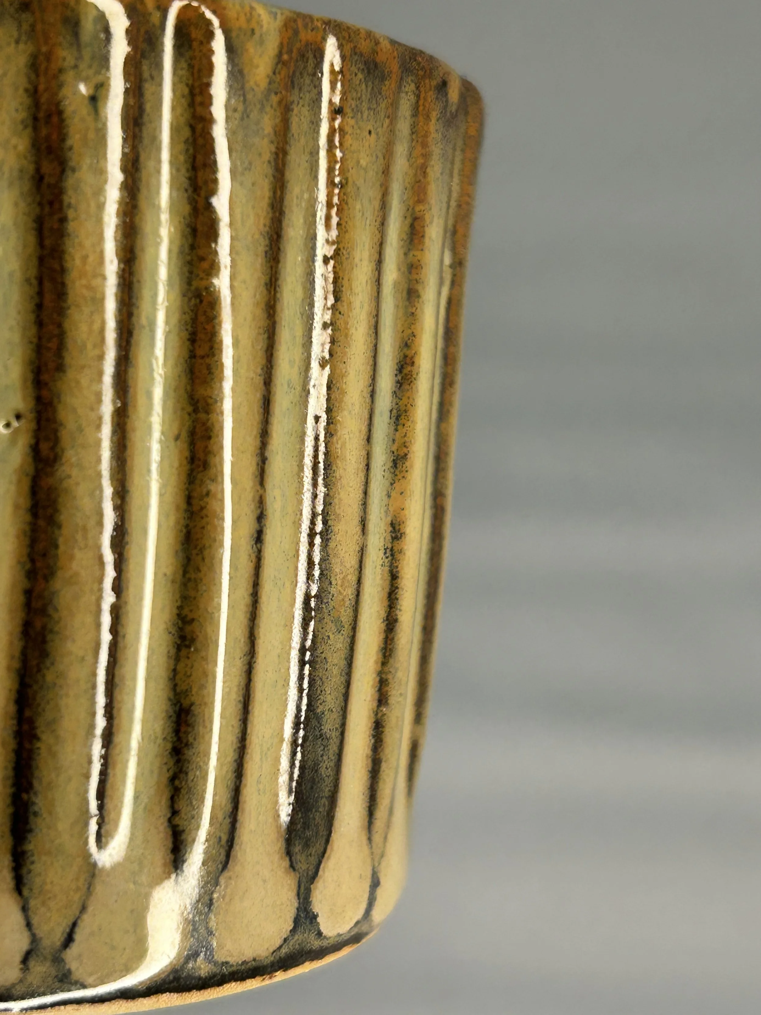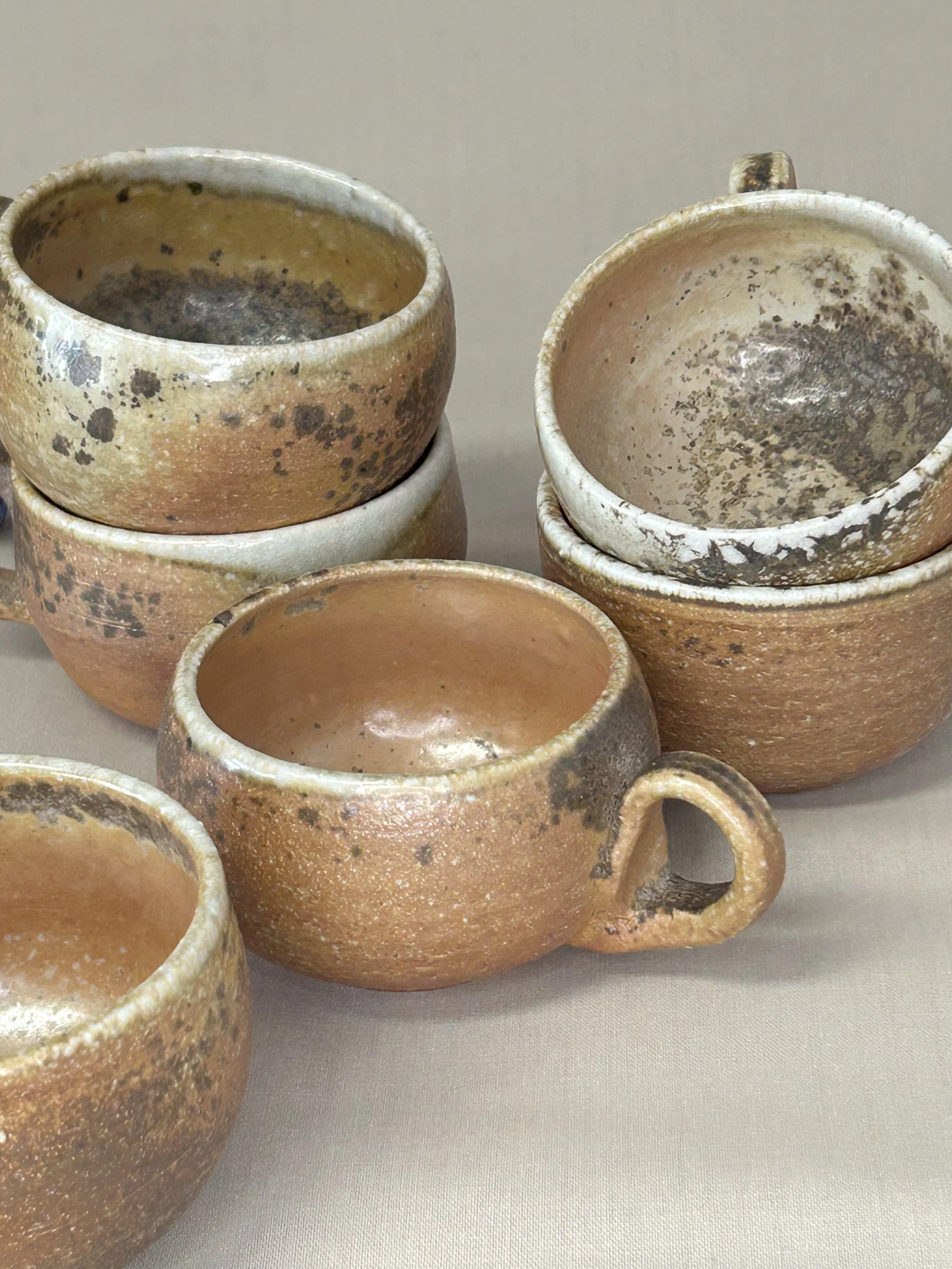 Die mittelgroßen Tassen sind mit feinen Shattering-Mustern verziert, die weiße Glasur bringt sie zum Vorschein; die grüne Glasur zeigt kleine punktförmige Effekte.