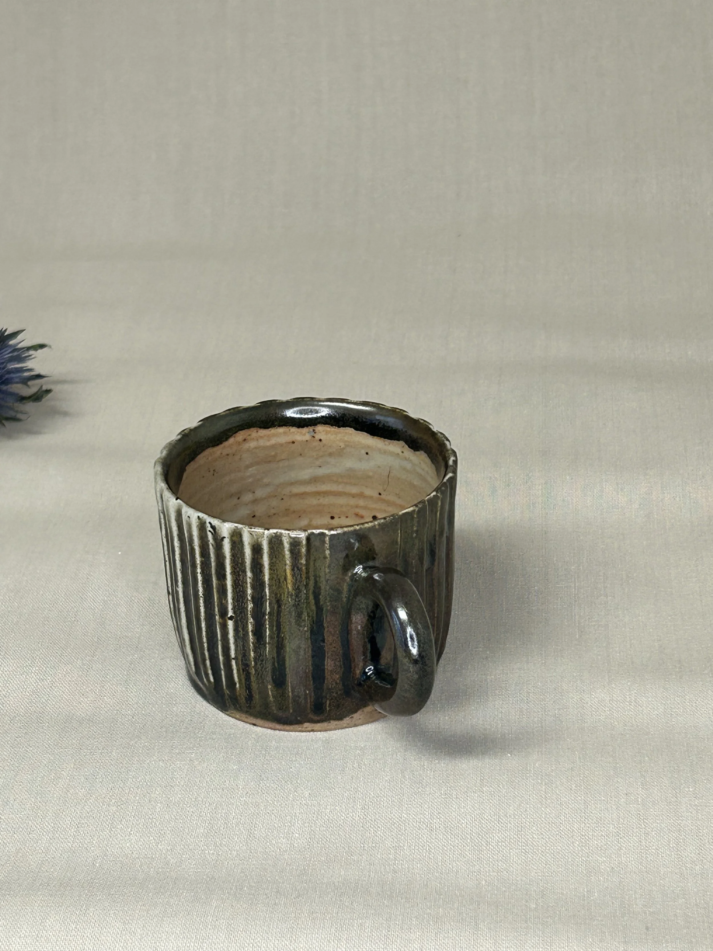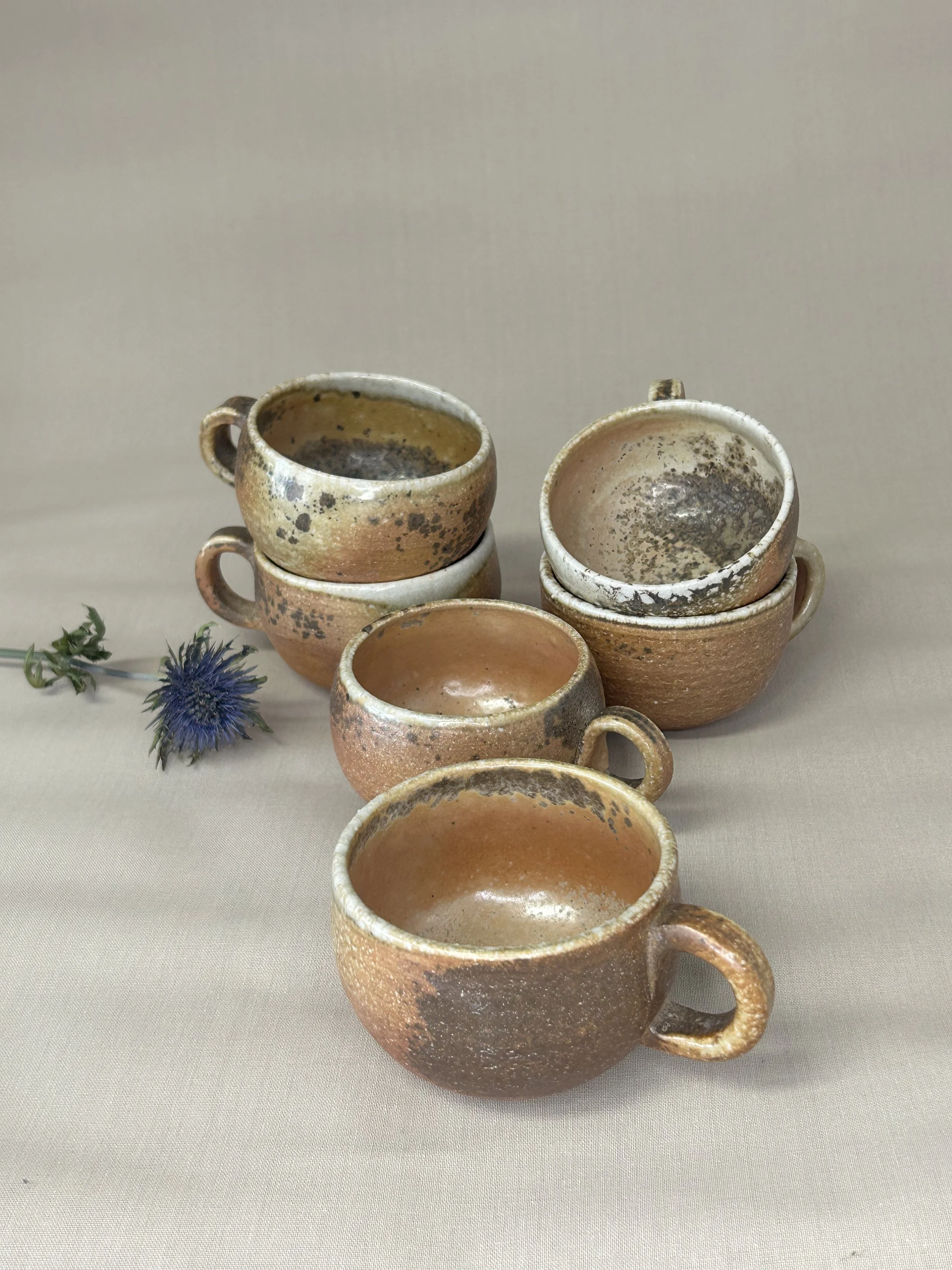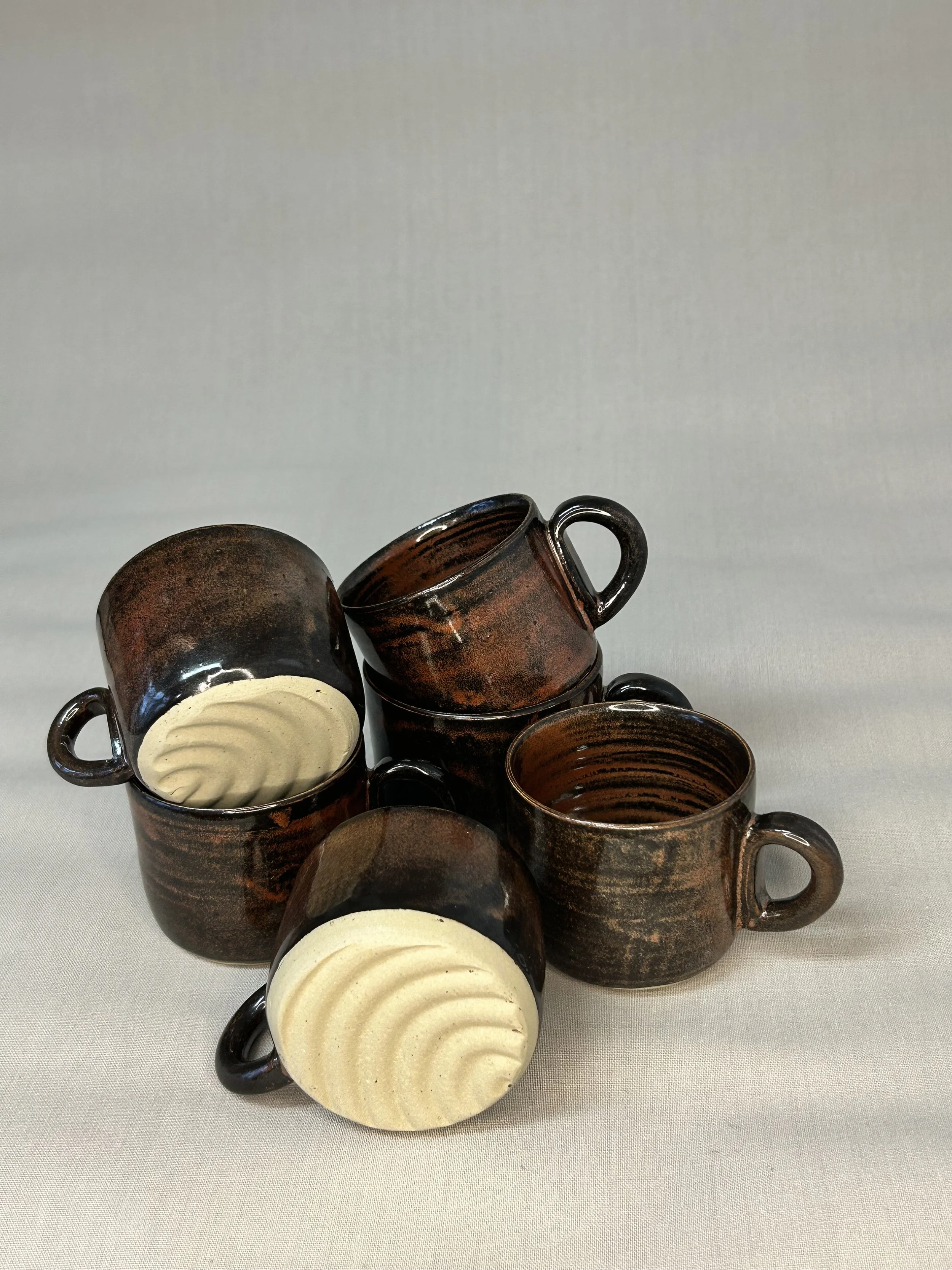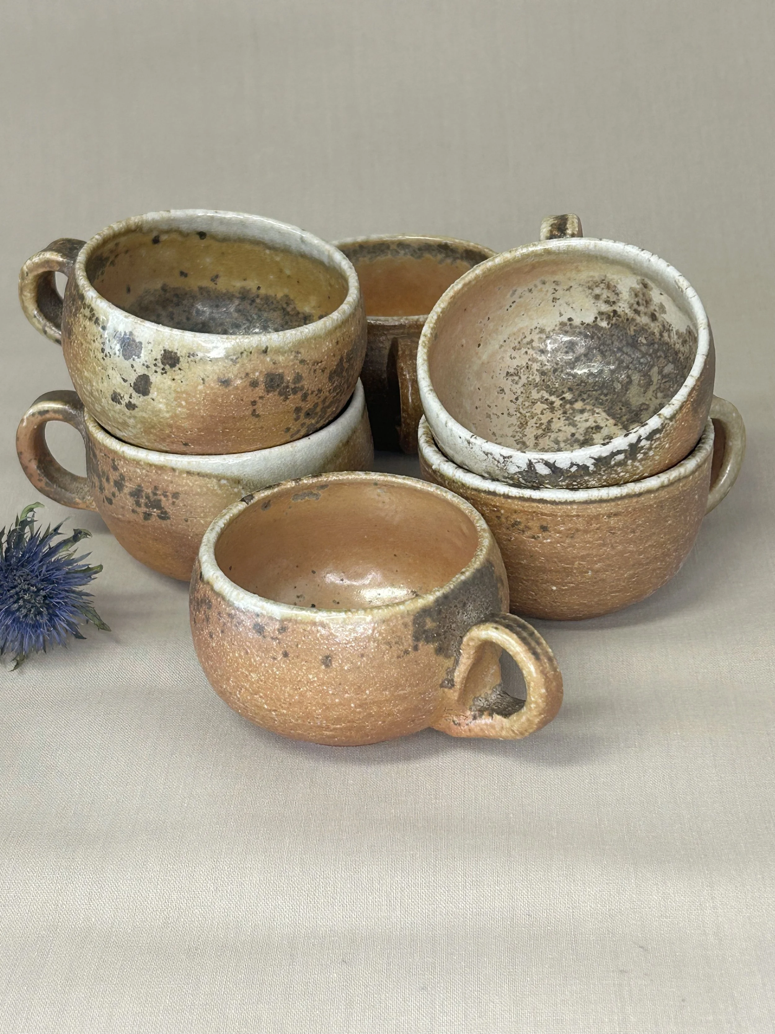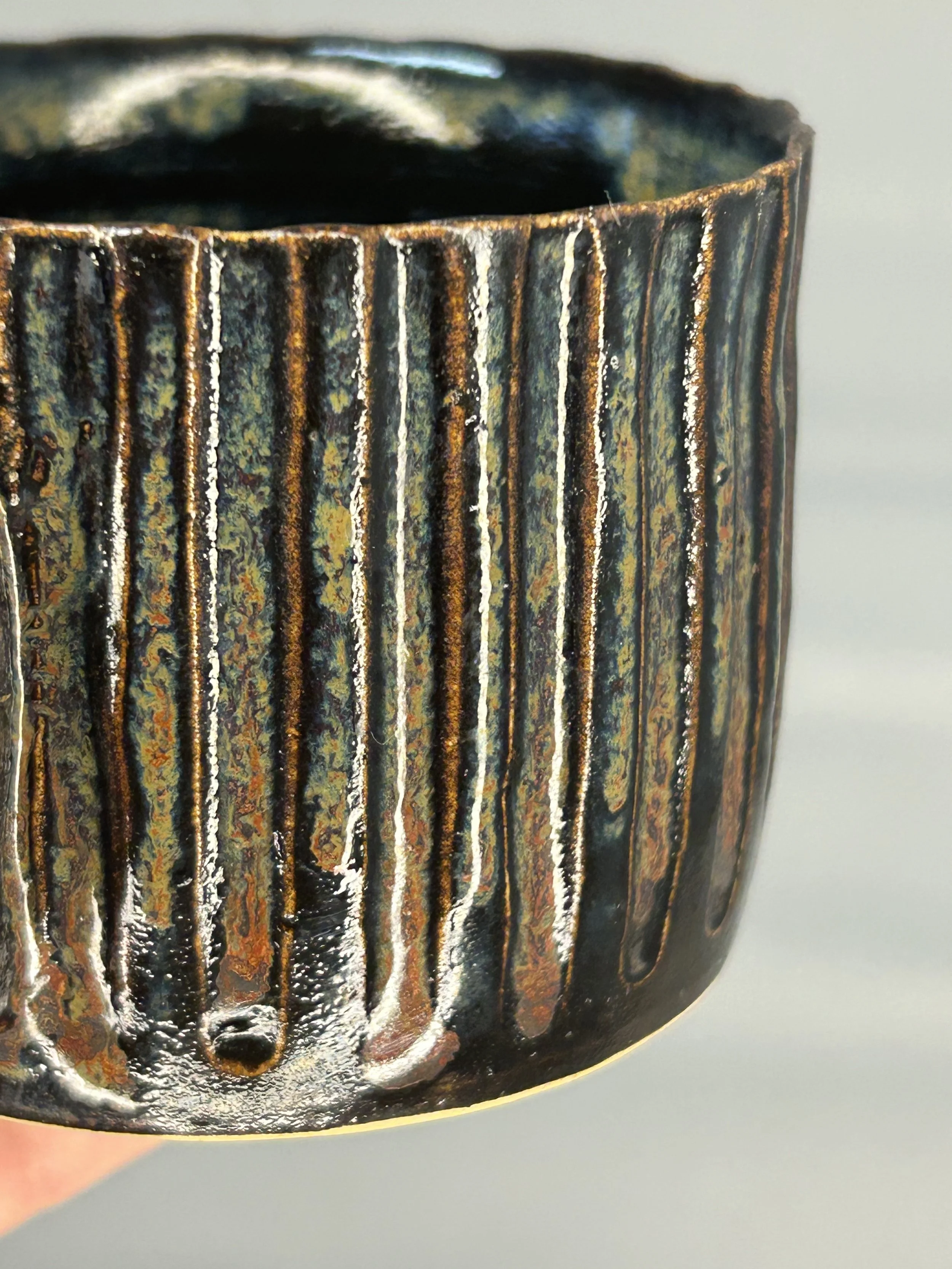 Die mittelgroßen Tassen sind mit feinen Shattering-Mustern verziert, die weiße Glasur bringt sie zum Vorschein; die grüne Glasur zeigt kleine punktförmige Effekte.