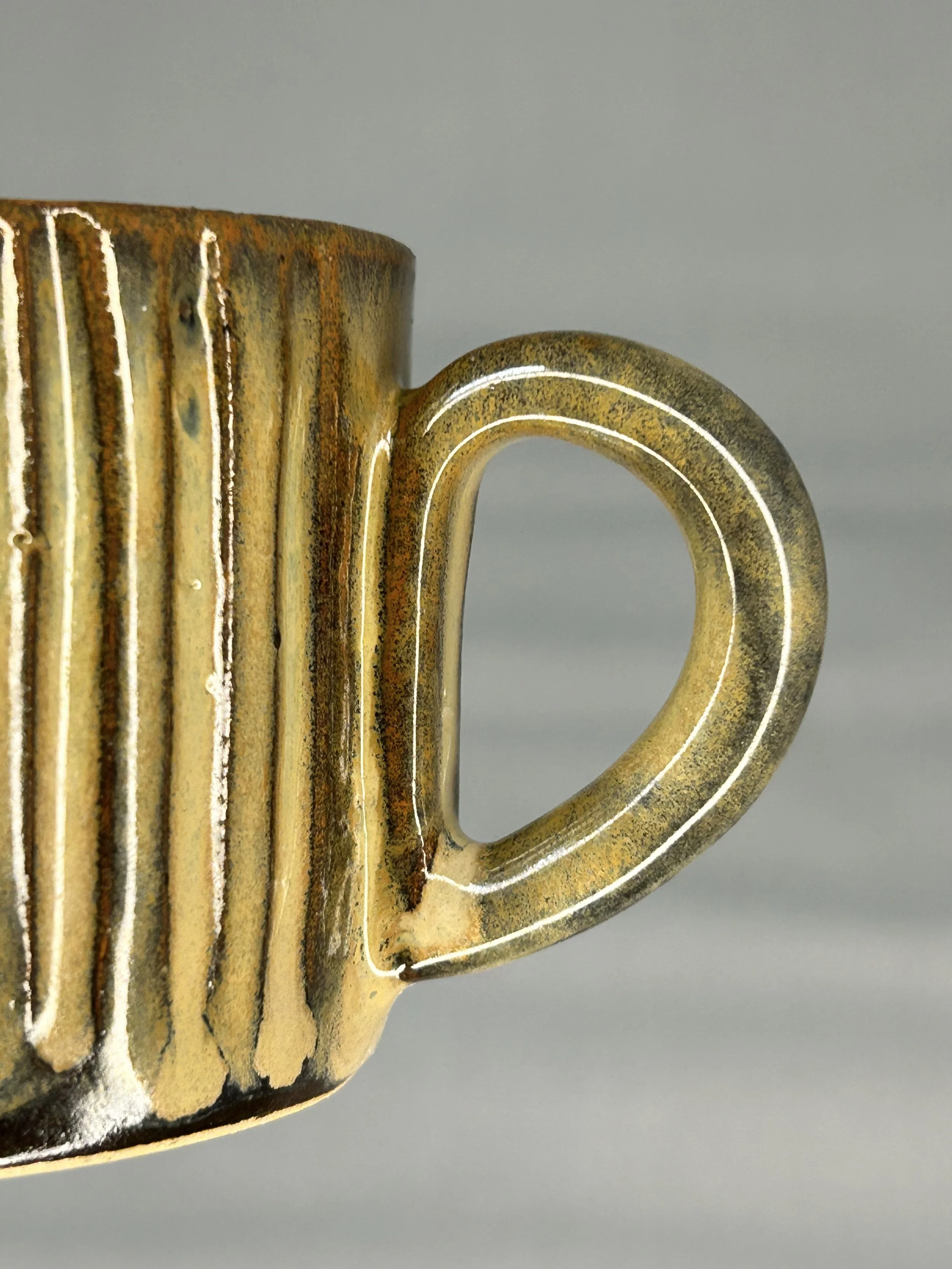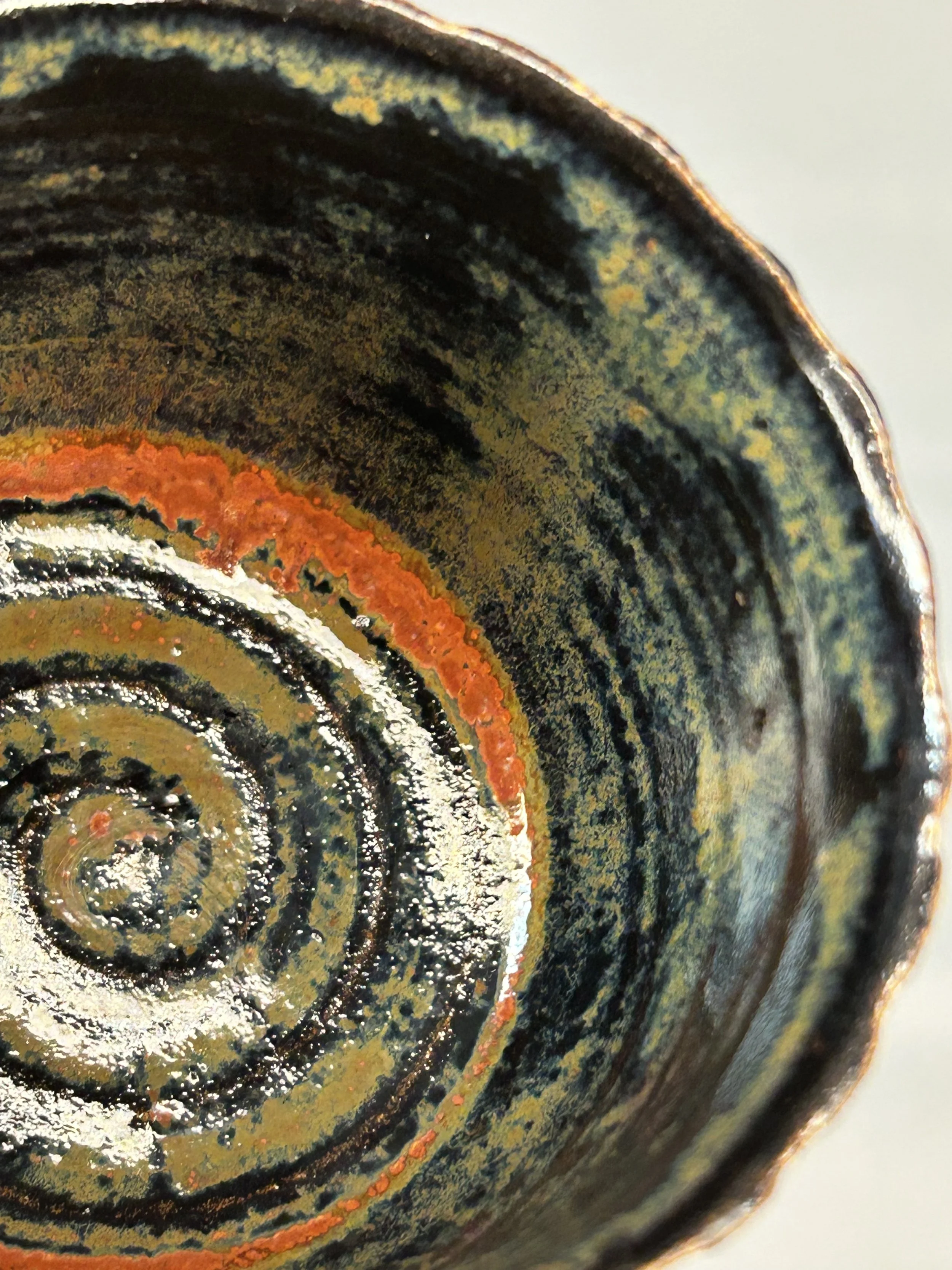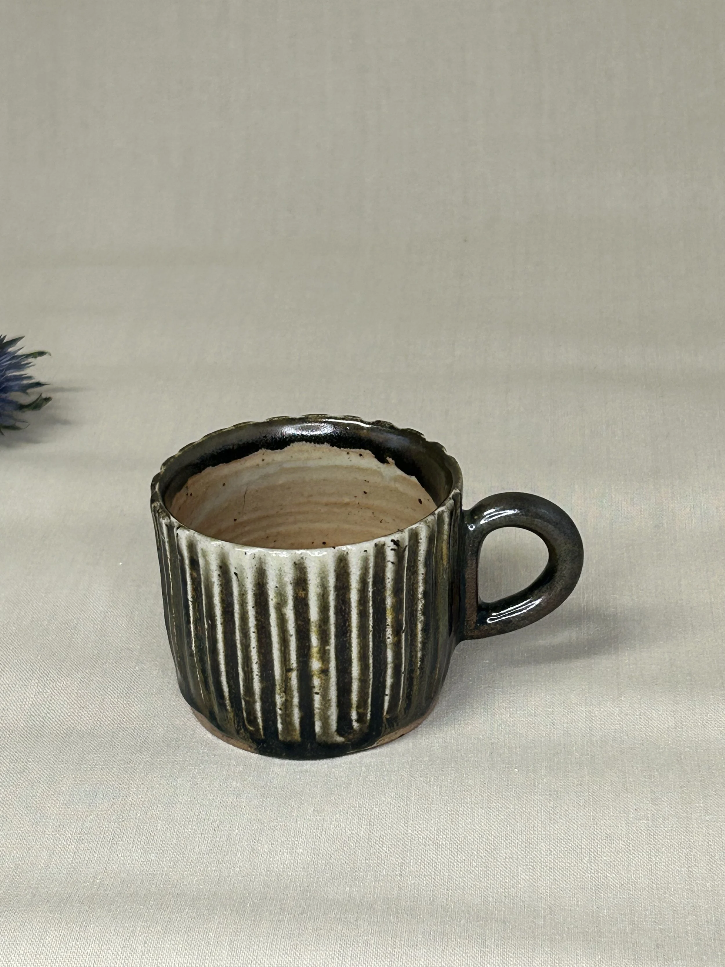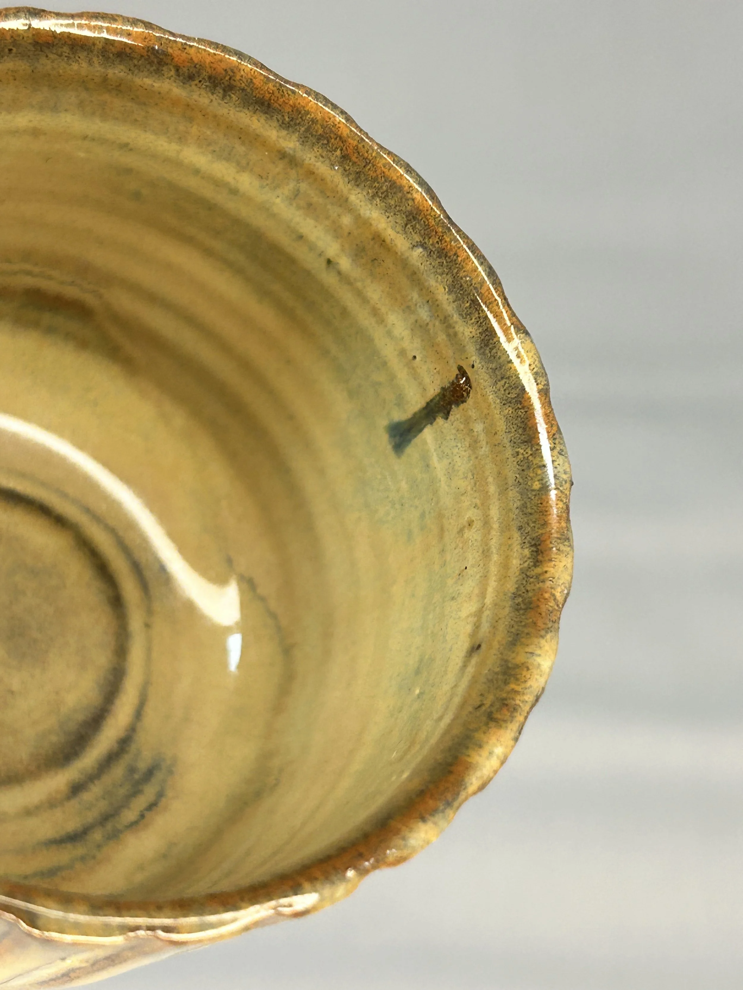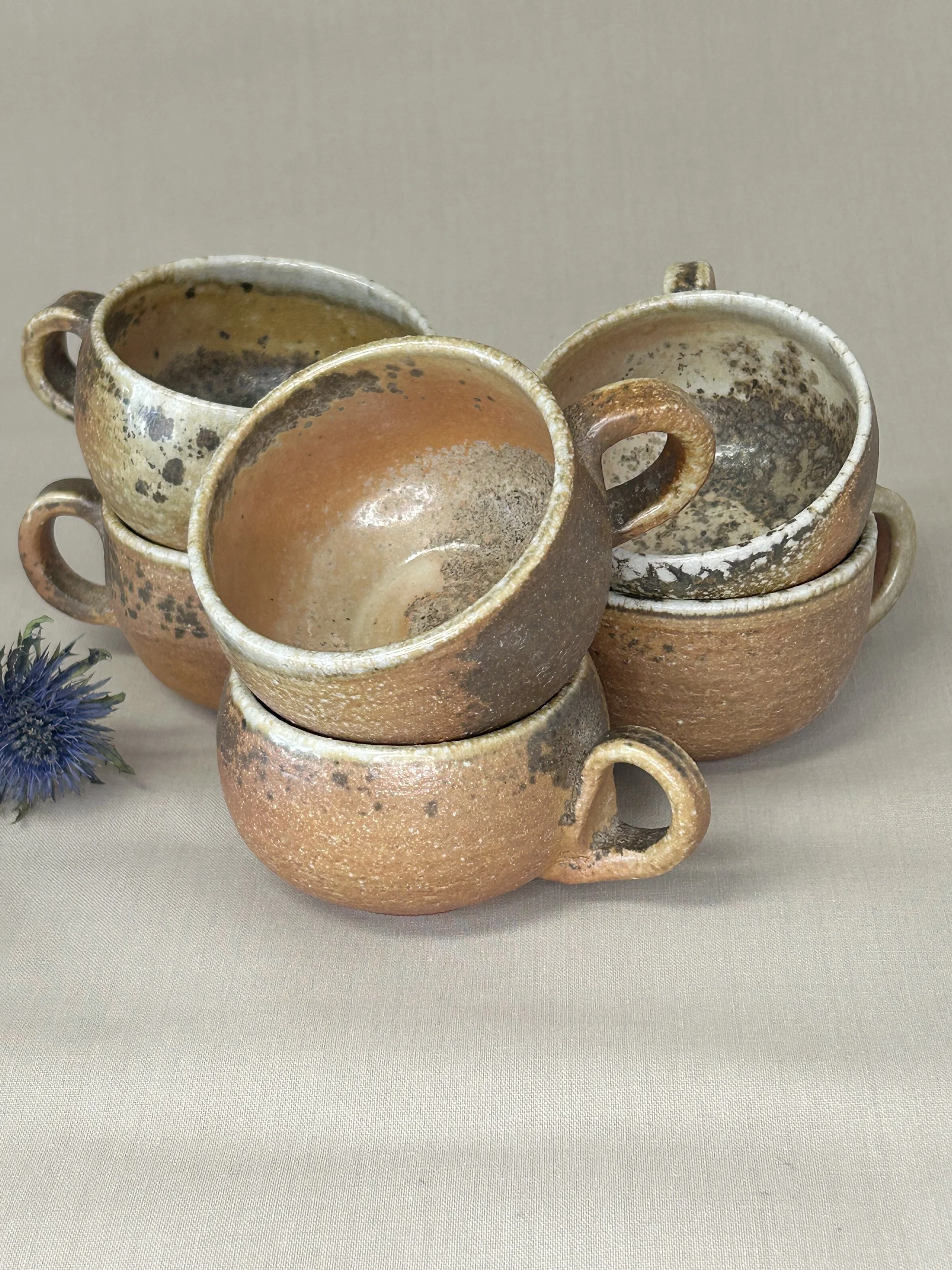 Die mittelgroßen Tassen sind mit feinen Shattering-Mustern verziert, die weiße Glasur bringt sie zum Vorschein; die grüne Glasur zeigt kleine punktförmige Effekte.