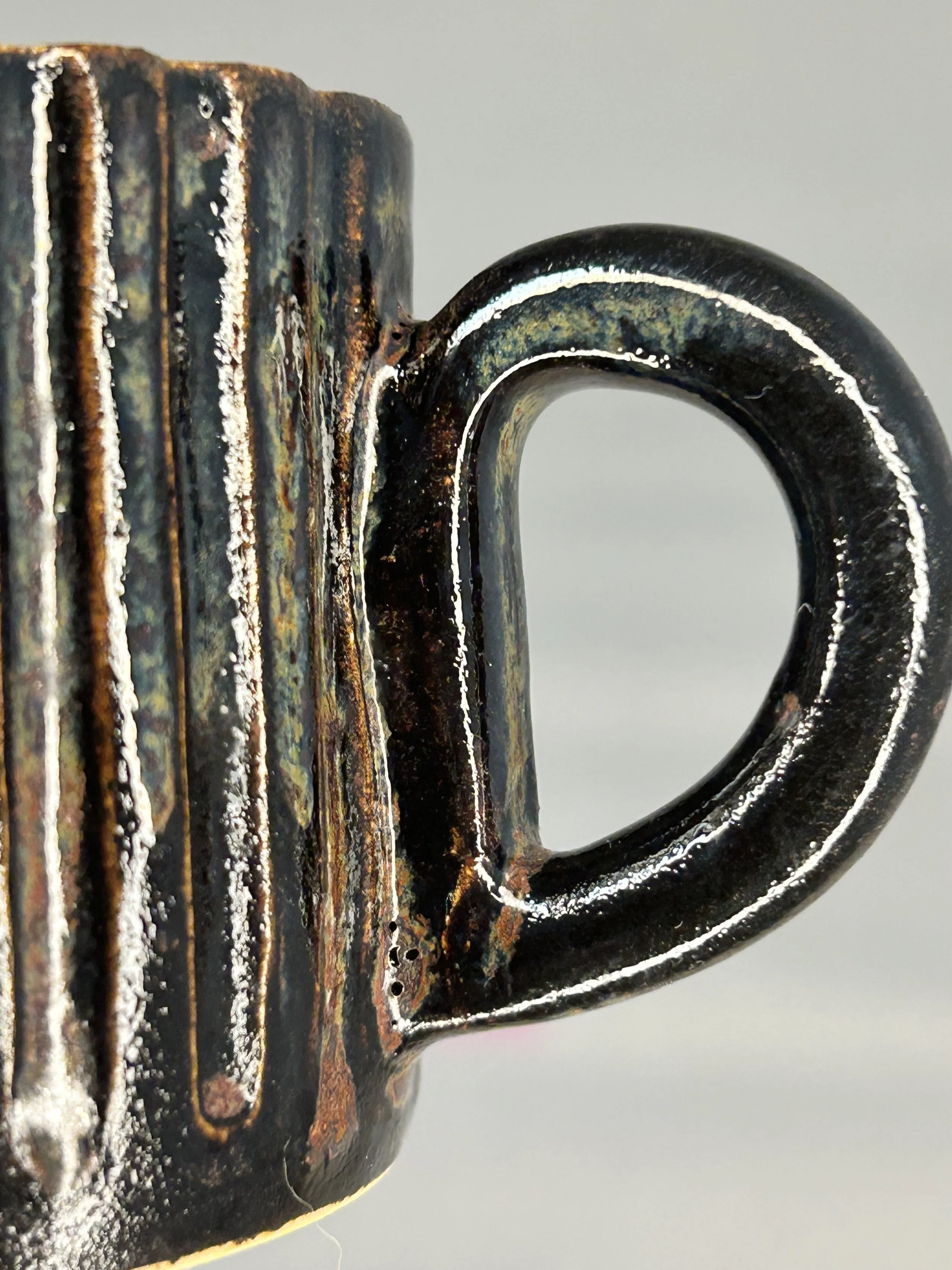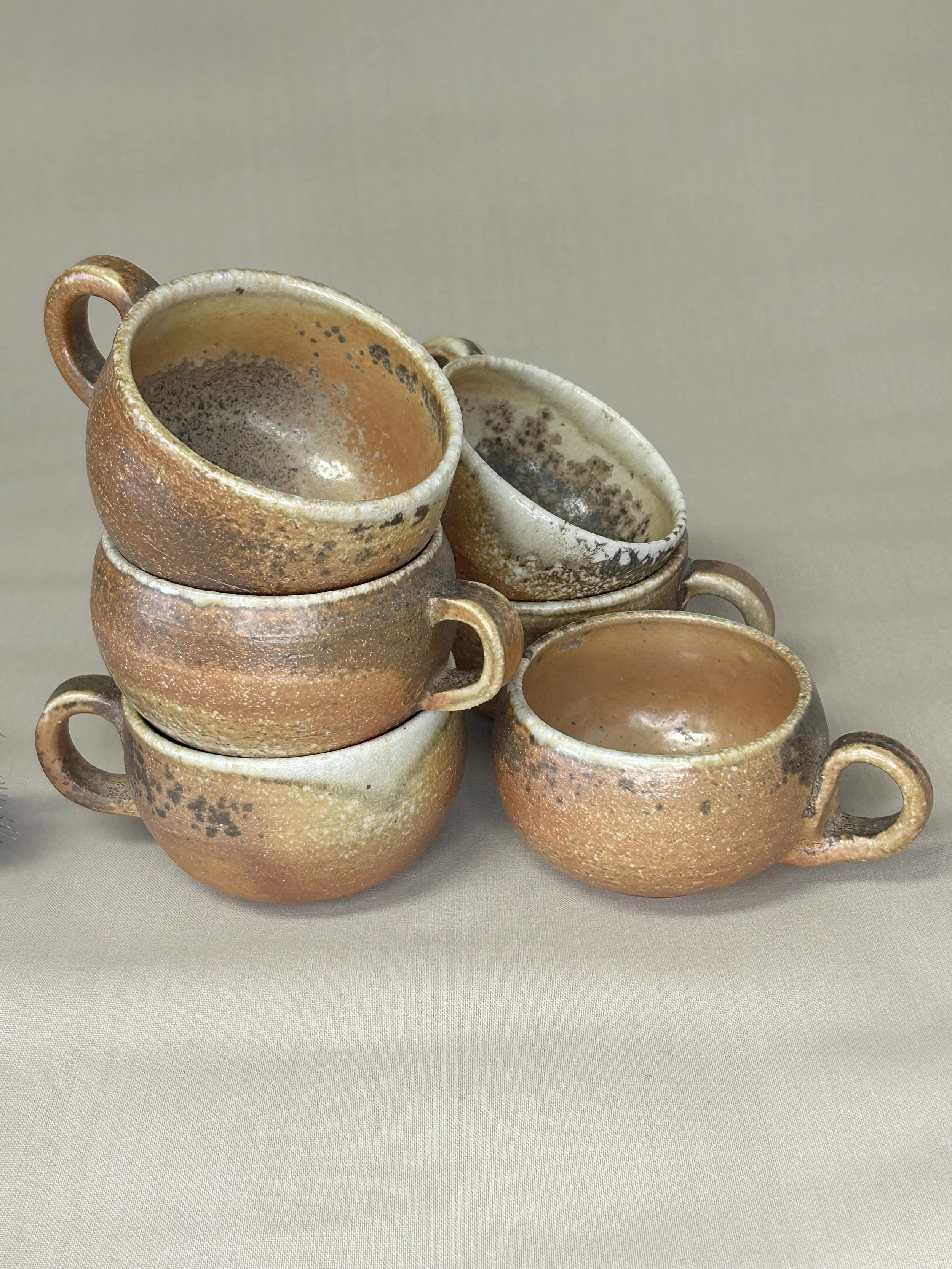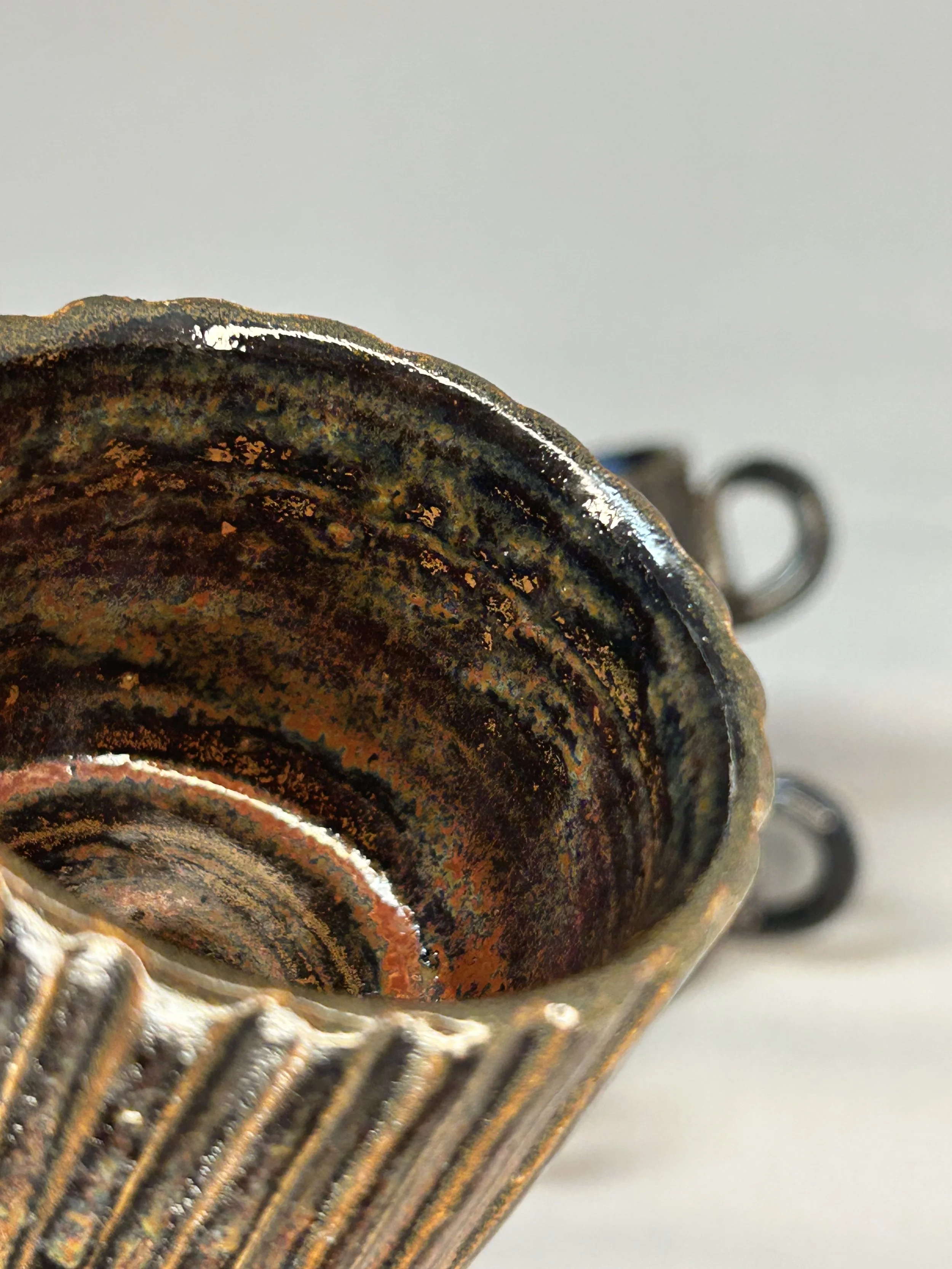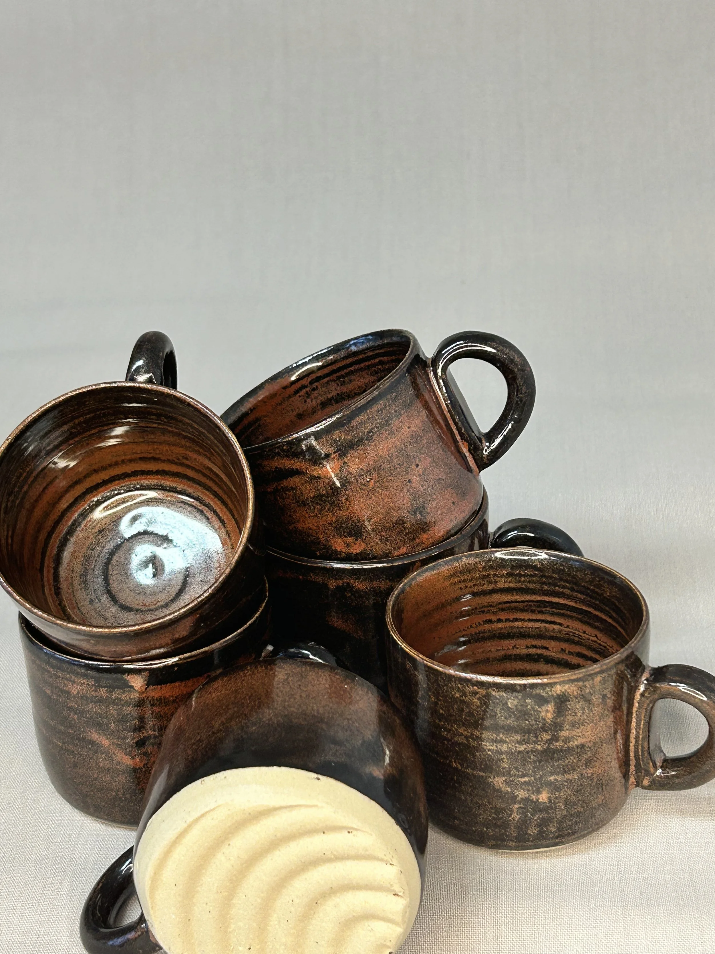 Die mittelgroßen Tassen sind mit feinen Shattering-Mustern verziert, die weiße Glasur bringt sie zum Vorschein; die grüne Glasur zeigt kleine punktförmige Effekte.